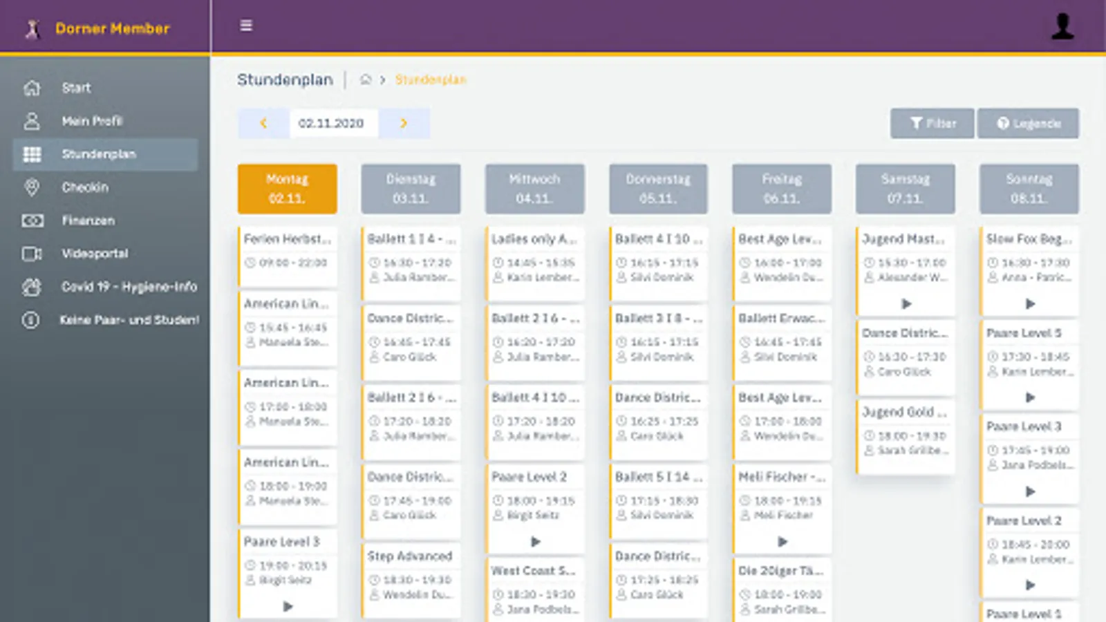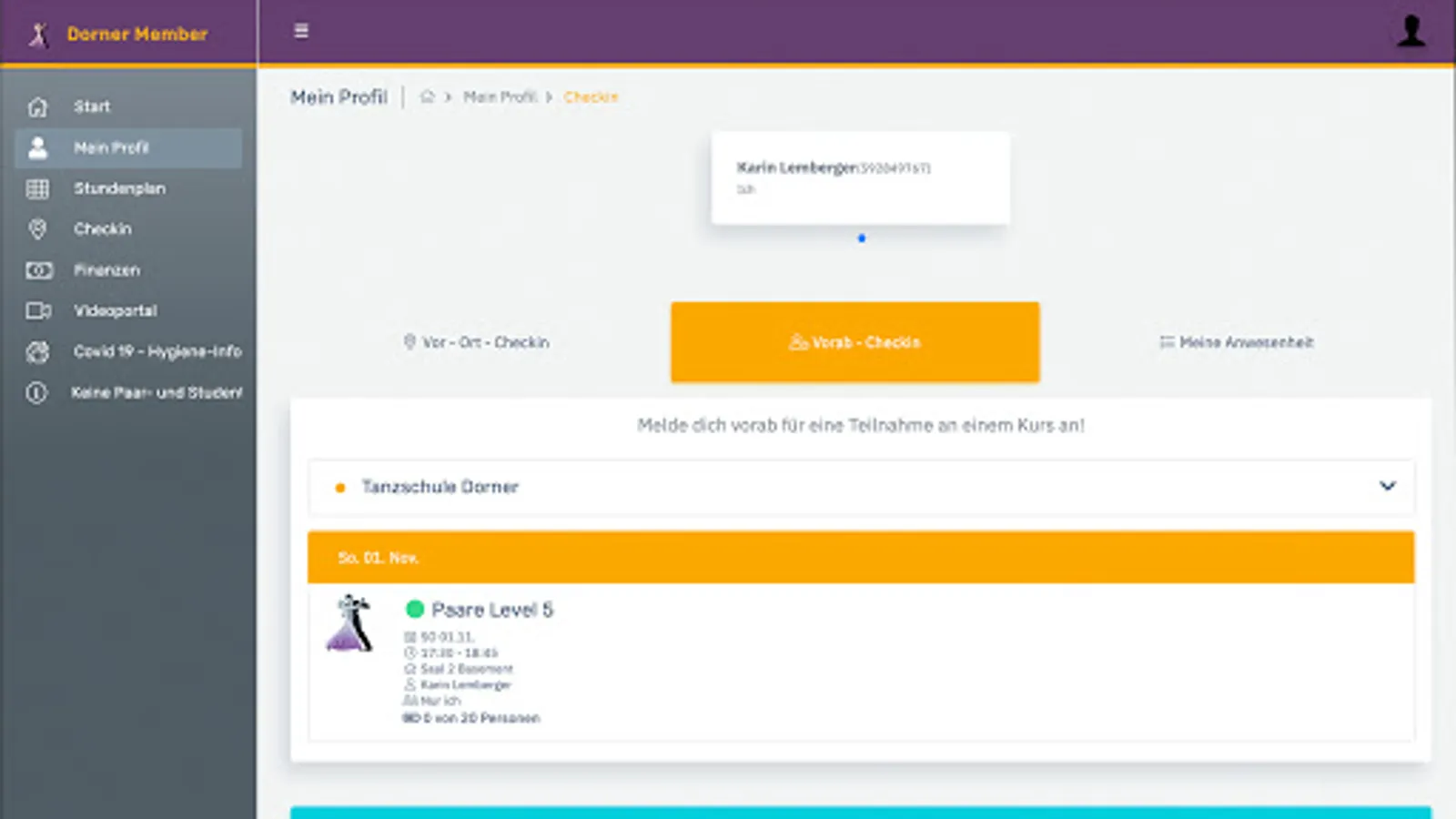 Stay up to date and easily find out about the latest news with your smartphone or tablet. The app offers many advantages such as the "advance check-in", timetables with course dates, event news, videos on dance figures and much more. In addition, you have access to personal encrypted master data, all bookings and invoices, as well as the current status of your beverage credit.