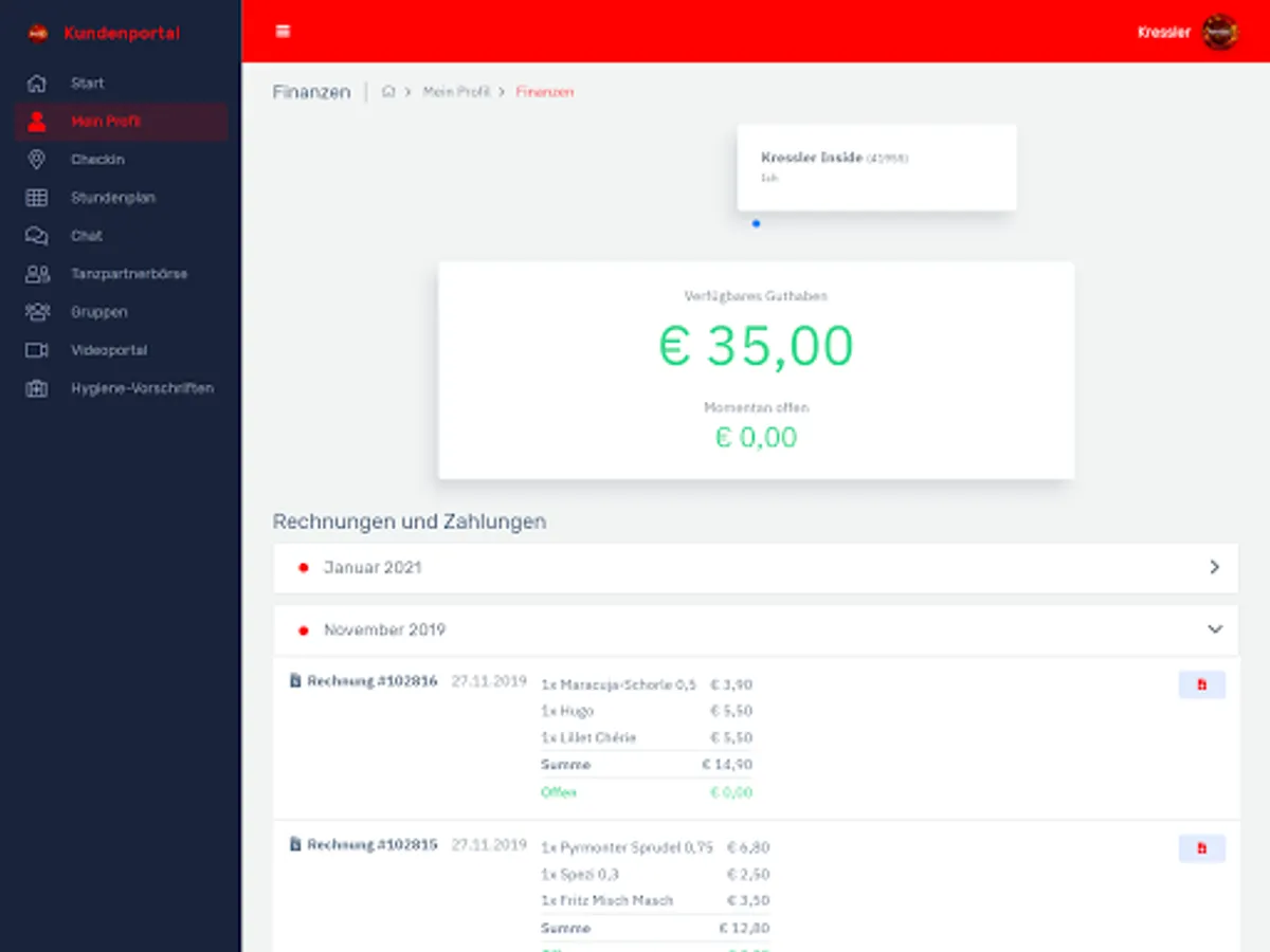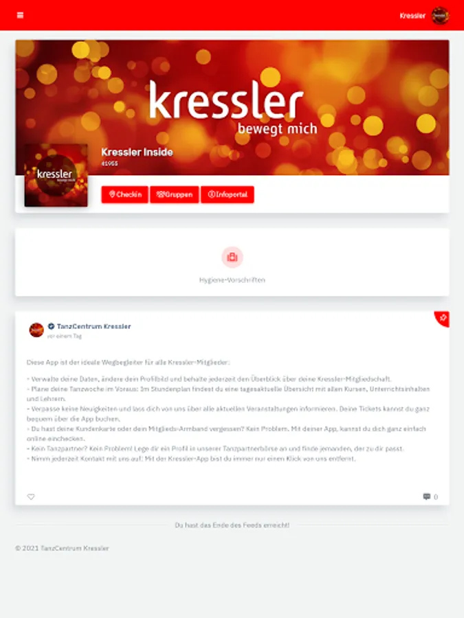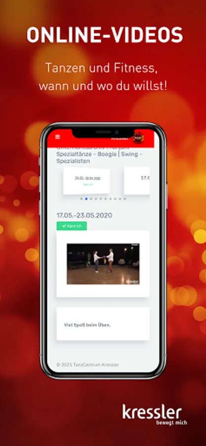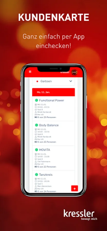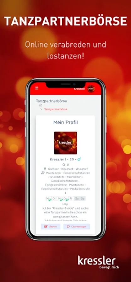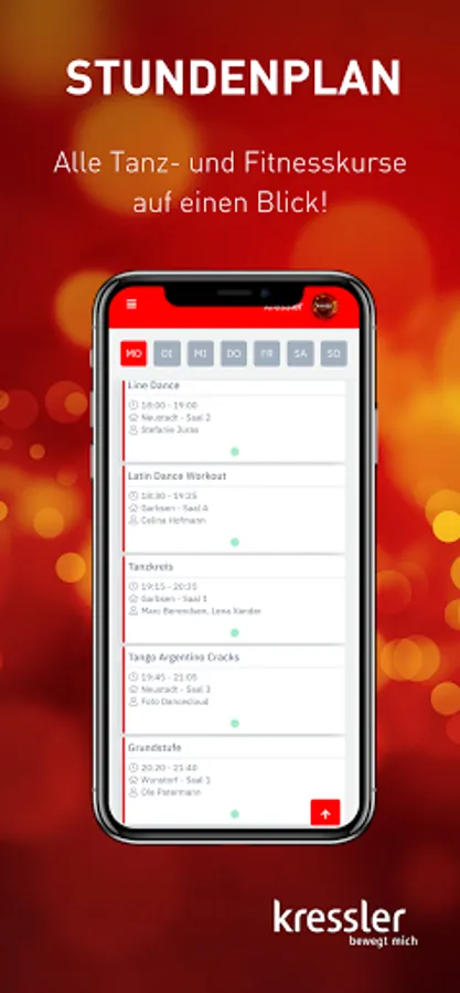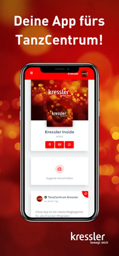 - Manage your data, change your profile picture and keep track of your Kressler membership at all times. - Plan your dance week in advance: In the timetable you will find an overview of all courses, lesson content and teachers that is updated daily. - Have you forgotten your customer card or your membership bracelet? With the app, you can easily check in online. - Don't miss any news and let us keep you informed about all current events. You can easily book your tickets via the app. - Dancing and fitness whenever and wherever you want: with our video portal you always have your online courses with you. - No dance partner? No problem! Create a profile in our dance partner exchange and find someone who suits you. - Contact us at any time: With the Kressler app, you are always just one click away from us.