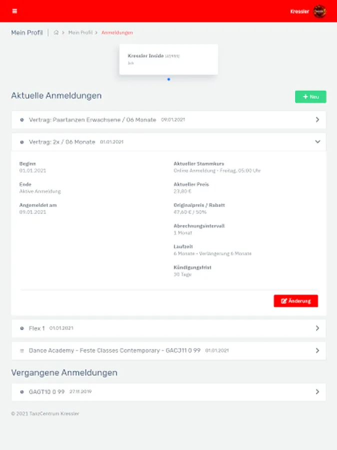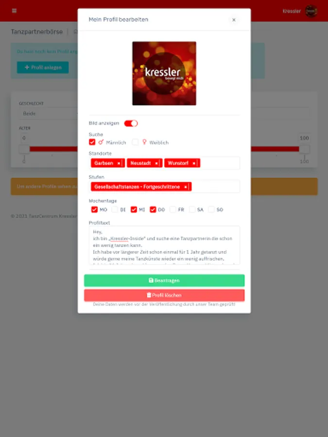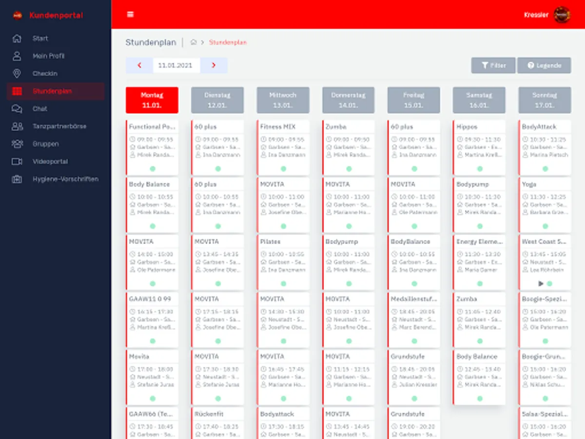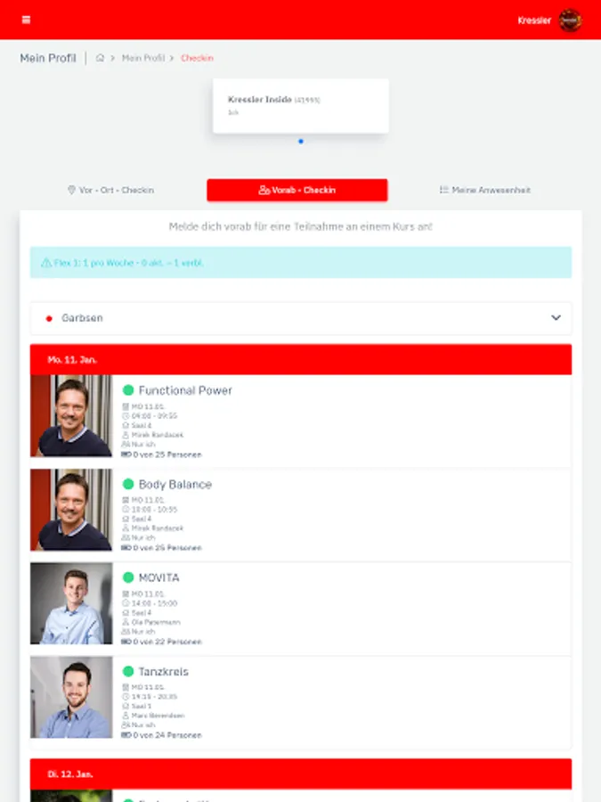 - Manage your data, change your profile picture and keep track of your Kressler membership at all times. - Plan your dance week in advance: In the timetable you will find an overview of all courses, lesson content and teachers that is updated daily. - Have you forgotten your customer card or your membership bracelet? With the app, you can easily check in online. - Don't miss any news and let us keep you informed about all current events. You can easily book your tickets via the app. - Dancing and fitness whenever and wherever you want: with our video portal you always have your online courses with you. - No dance partner? No problem! Create a profile in our dance partner exchange and find someone who suits you. - Contact us at any time: With the Kressler app, you are always just one click away from us.