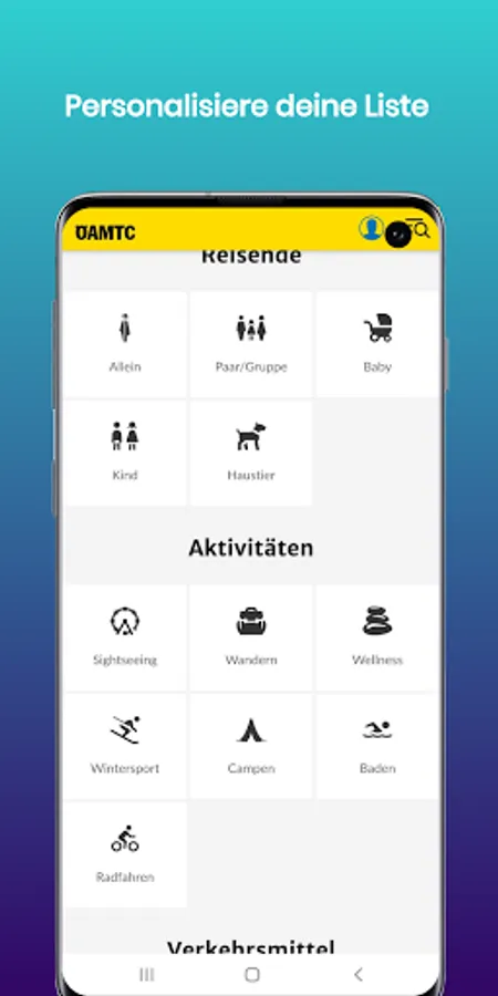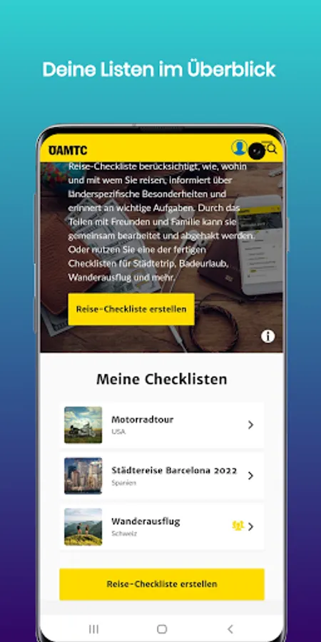 Use the ÖAMTC travel app "Meine Reise" and receive not only the travel checklist but also worldwide travel information for planning your vacation! You can also display sights in your travel destination and use other functions such as the travel cash desk, the audio phrasebook or the ÖAMTC emergency assistance assistant.