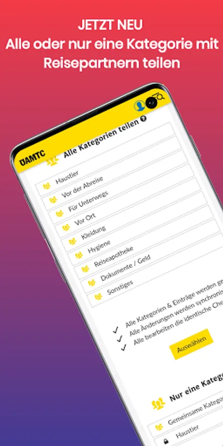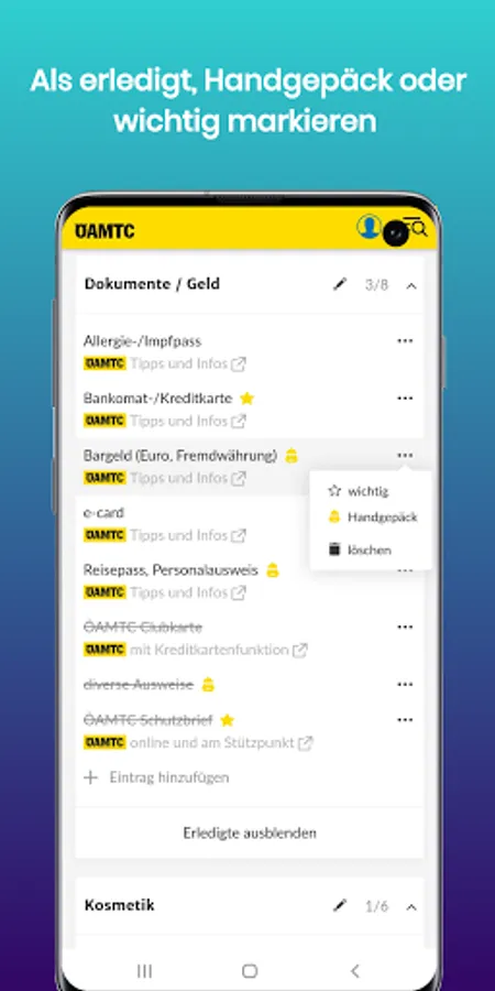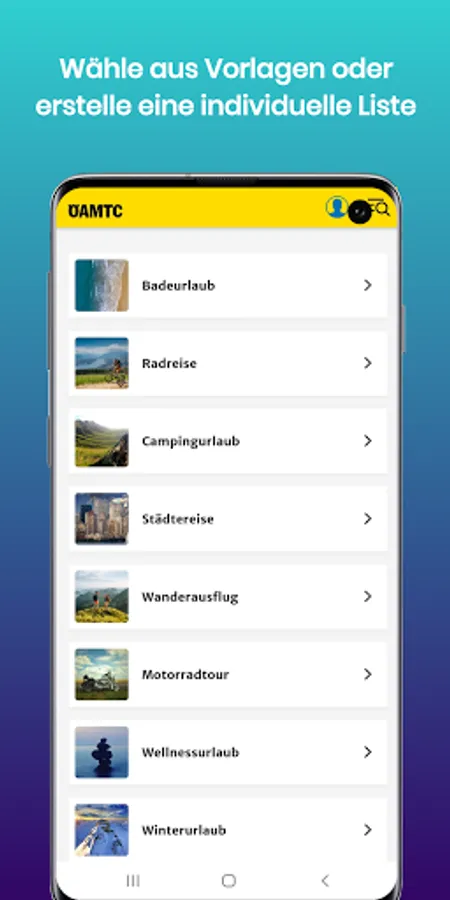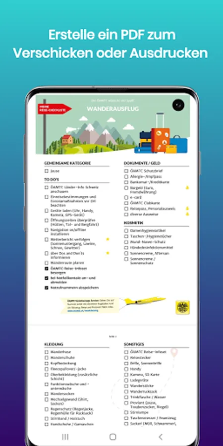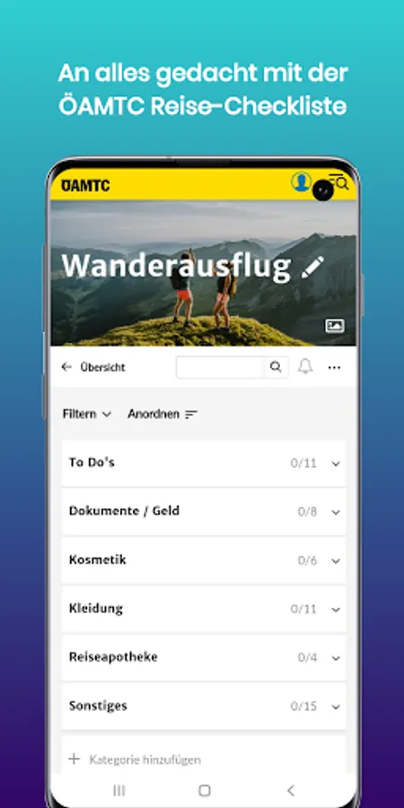 The ÖAMTC travel checklist takes into account how, where and with whom you are traveling, provides information about country-specific features and reminds you of important tasks. By sharing it with friends and family, it can be edited and checked off together. Or use one of the ready-made checklists for city trips, beach holidays, hiking trips and more.