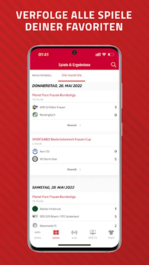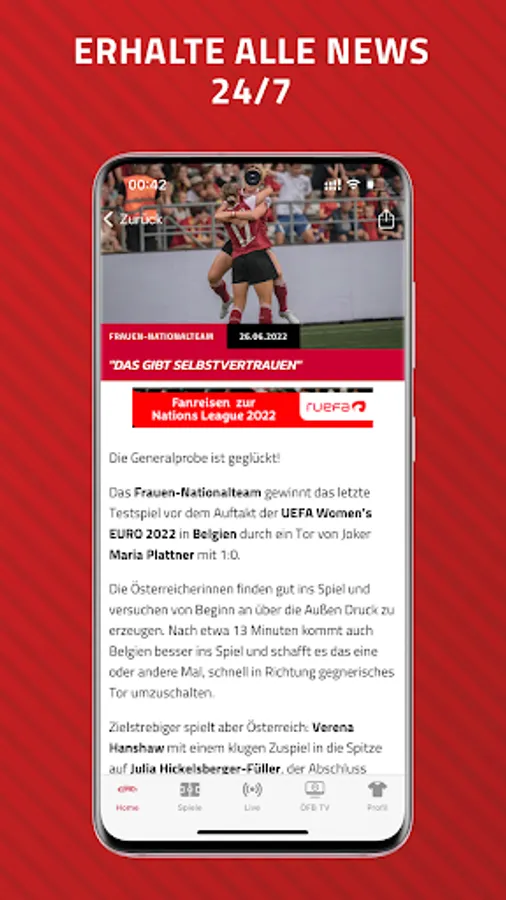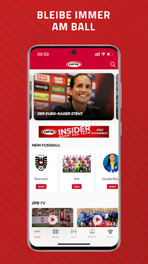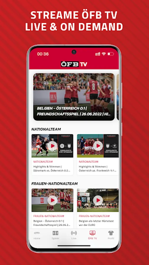 You don't want to miss any live streams from the UNIQA ÖFB Cup, the Planet Pure Women's Bundesliga, the 1st ÖFB Futsal League, youth and grassroots football? No problem, you can now stream all ÖFB TV live broadcasts directly in the ÖFB app. In addition, you can access the latest and most popular videos about our national teams at any time.