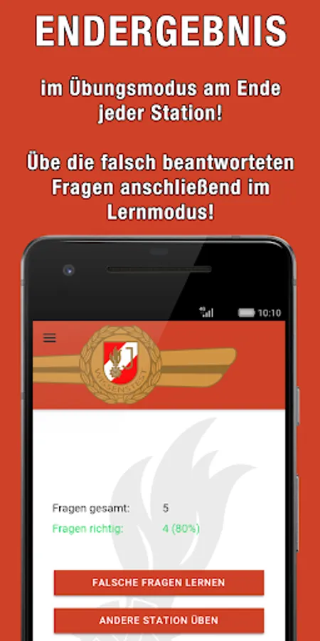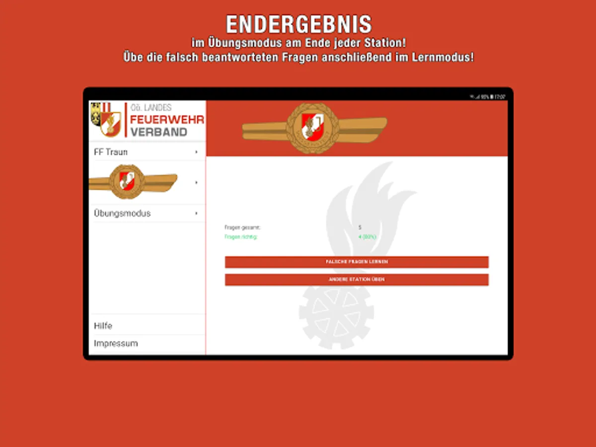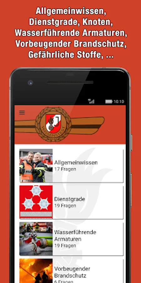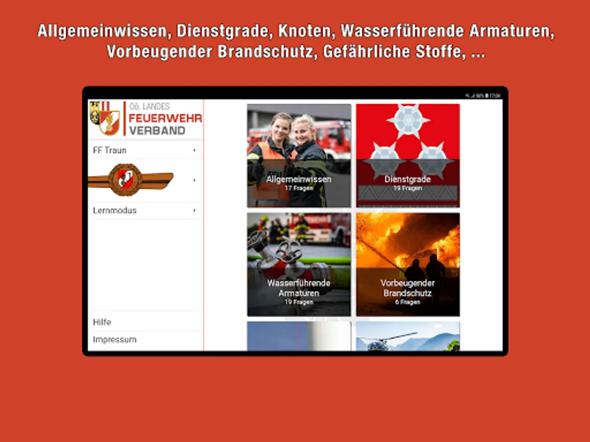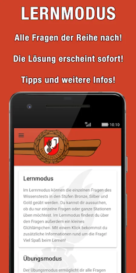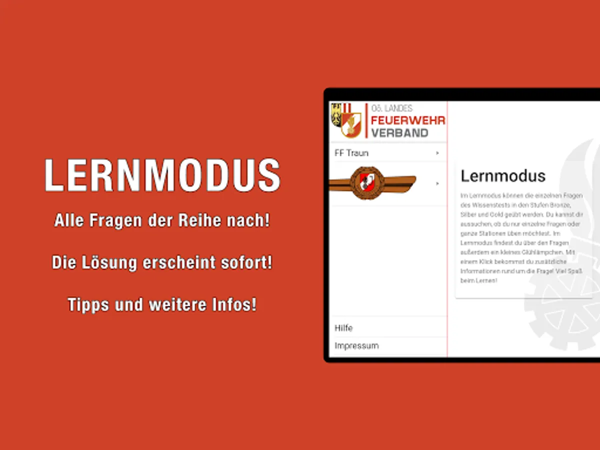 With this app you can apply for the fire brigade youth knowledge test in Bronze, Silver and Gold in the stations General Knowledge, Water Fittings, Preventive Fire Protection, Ranks, First Aid and Accident Prevention, Traffic Education and Securing Agencies, Knot Science, Dangerous Substances, Messaging, The Tactical Prepare units in action as well as respiratory and body protection.
