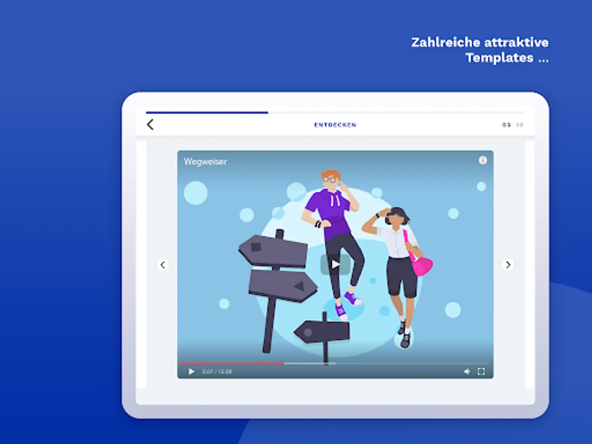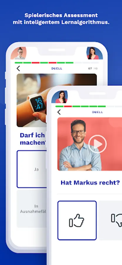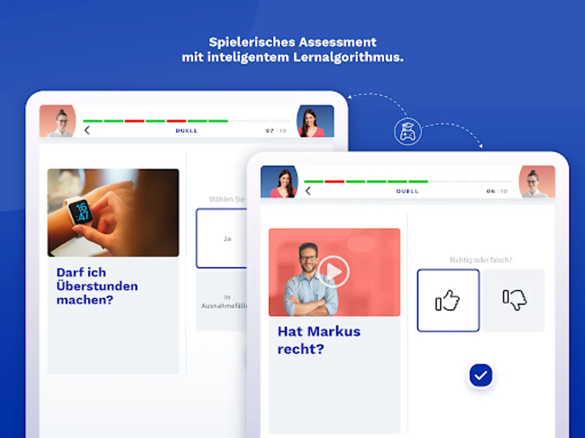 Appealing and interactive learning units (microtraining) are displayed on a variety of flashcards (text, image, video, 3D, VR, scene, dialogue, tasks and decisions) and continuously reviewed by a multiplayer quiz duel. Learned knowledge will be consolidated in the long term.