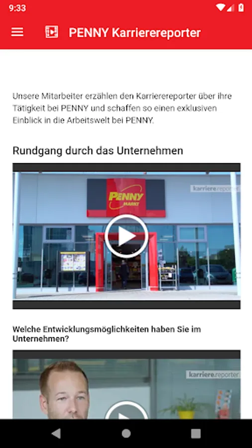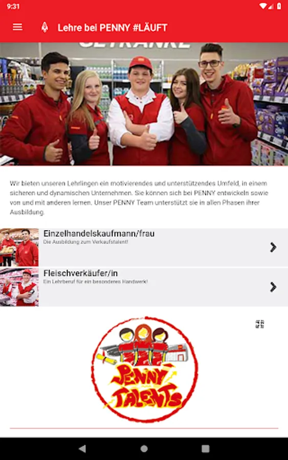 The Team PENNY app provides all PENNY users with an insight into PENNY, information about activities around the company, as well as a comprehensive overview of PENNY as an employer and the apprenticeship professions. At a glance you will find PENNY's latest news, sustainability information and the PENNY customer magazine for electronic reading. Through the PENNY career reporter, PENNY enthusiasts get a comprehensive and exclusive insight into the working world of PENNY. With its own staffing area, the app provides an additional secure area for all PENNY employees, including internal news, employee benefits, electronic employee card, and digital roster.
