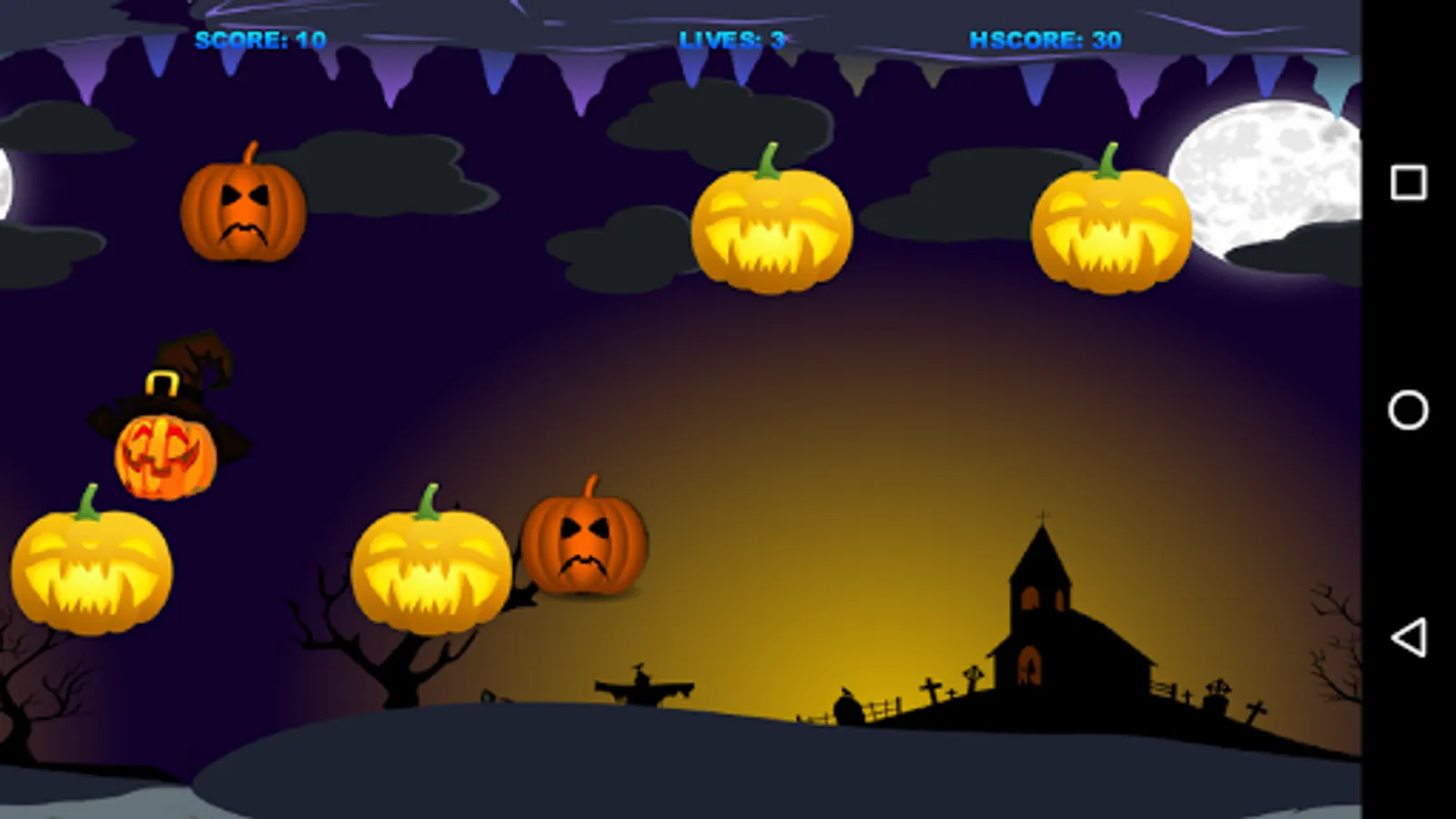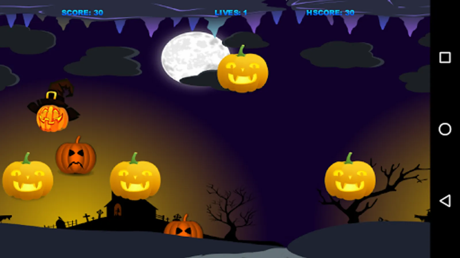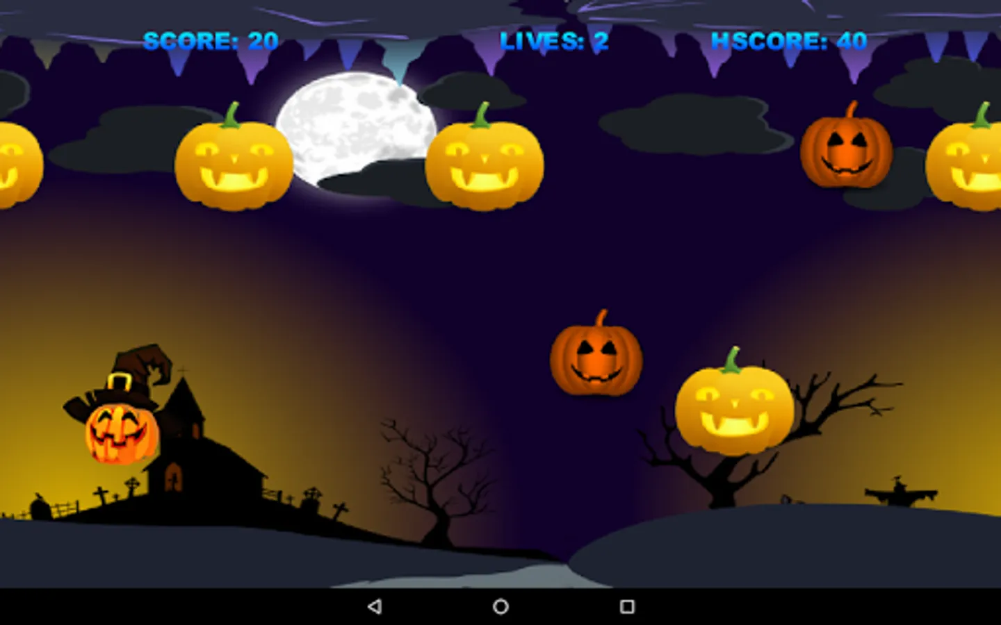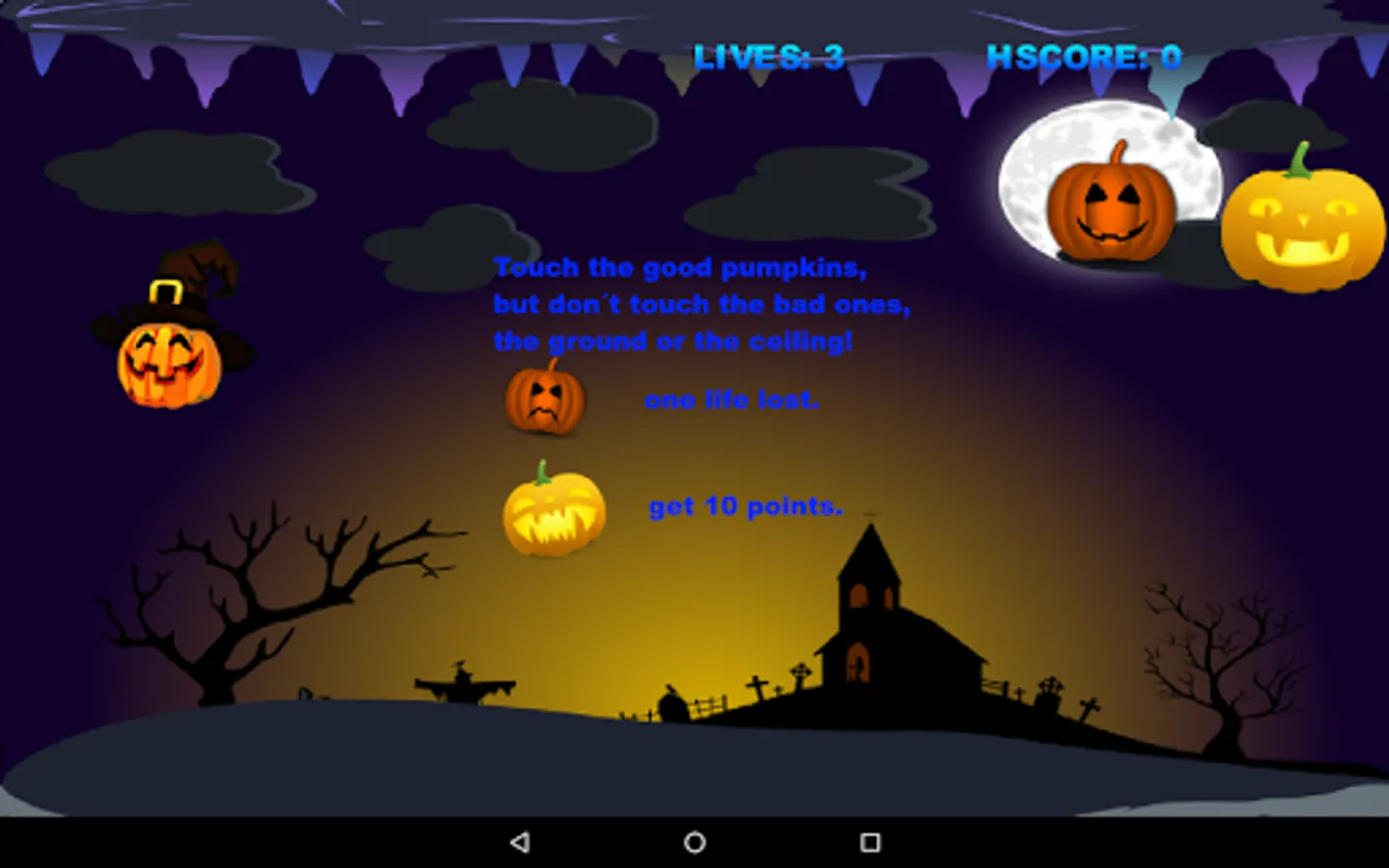 Touch the screen to move the Pumpkin Witch. Collect all the good pumpkins, but not the bad ones. Don´t touch the ceiling or the ground, otherwise you will die.