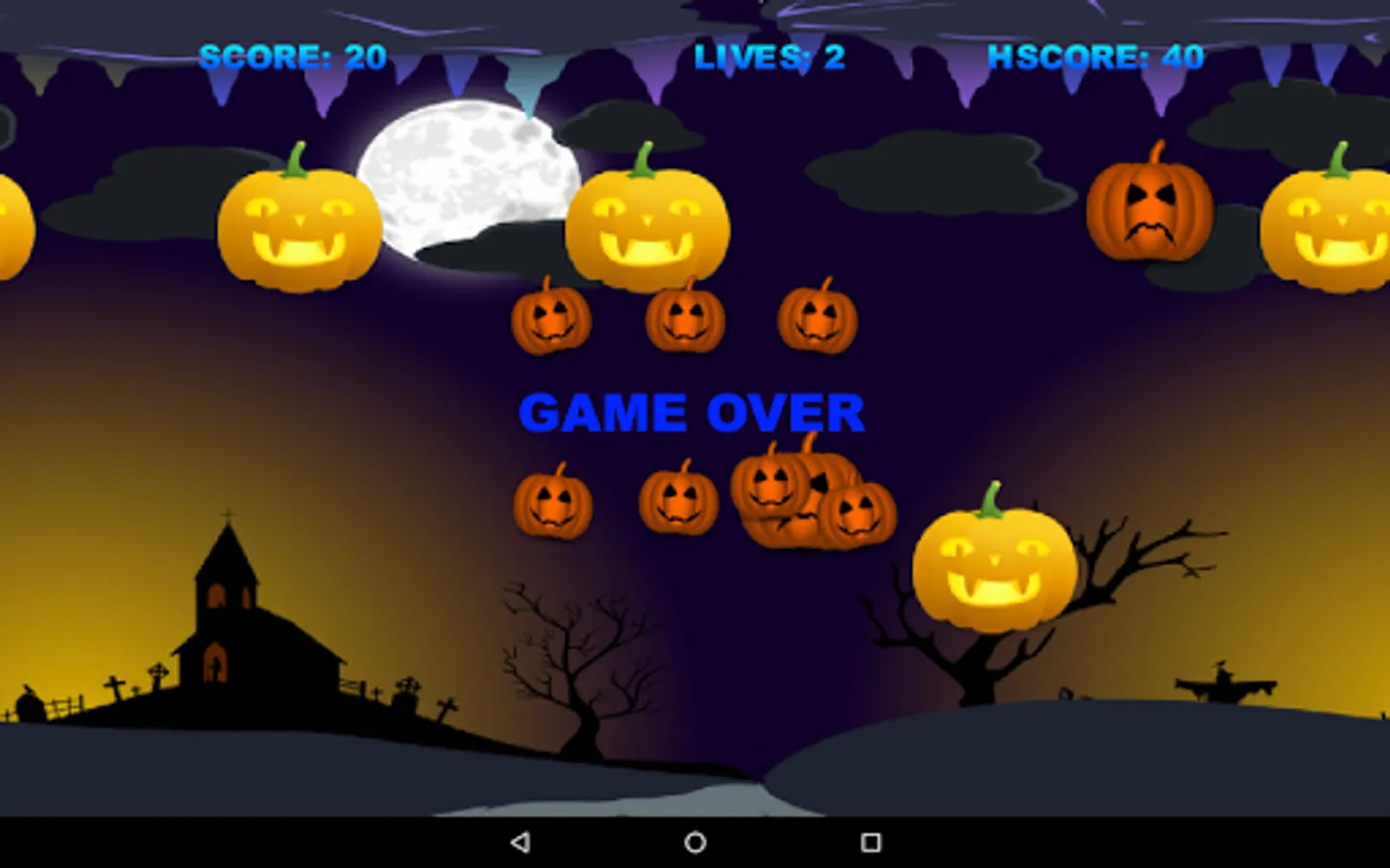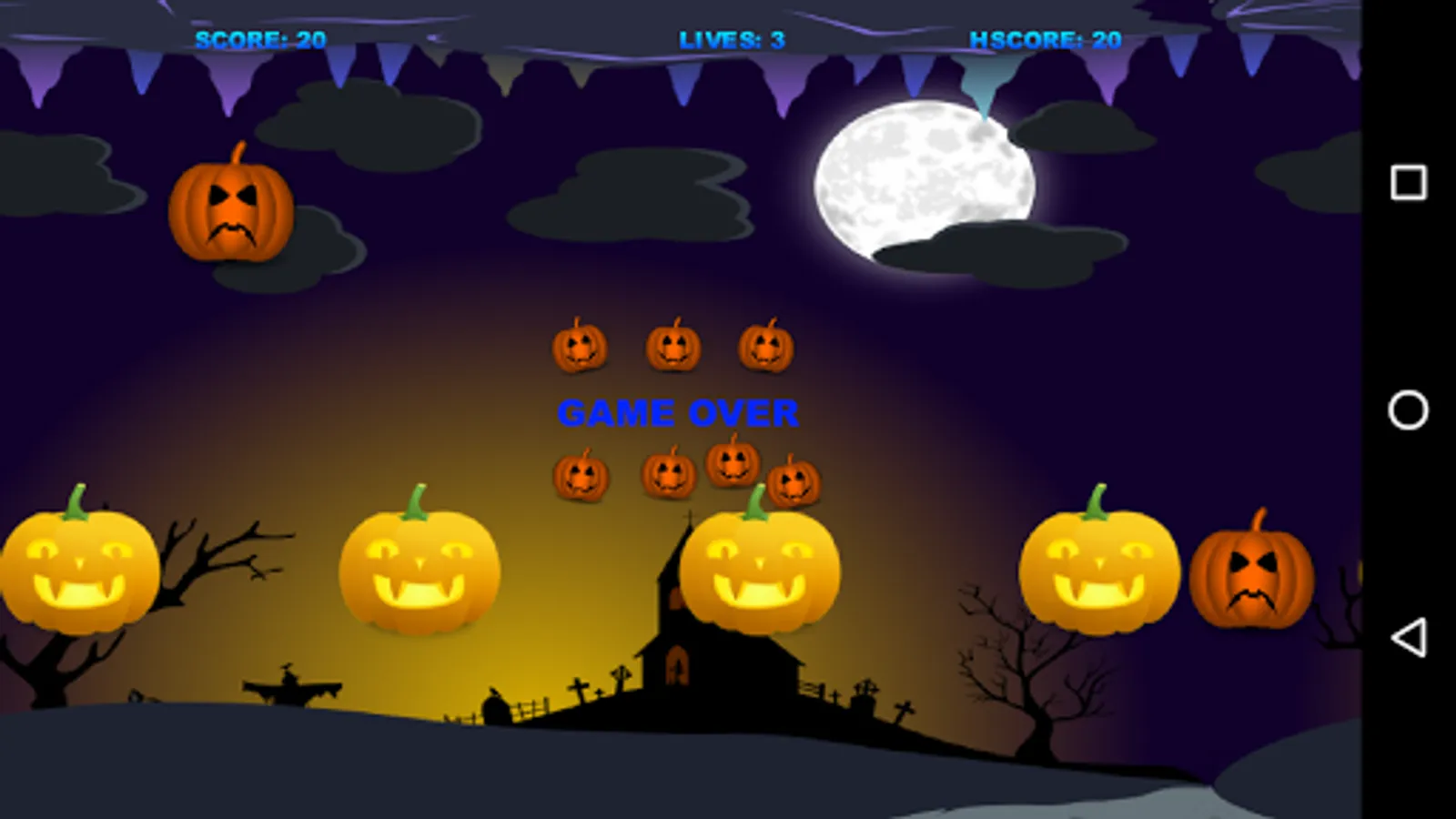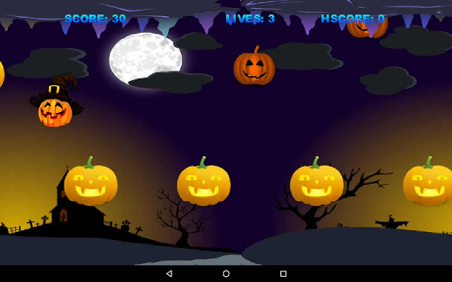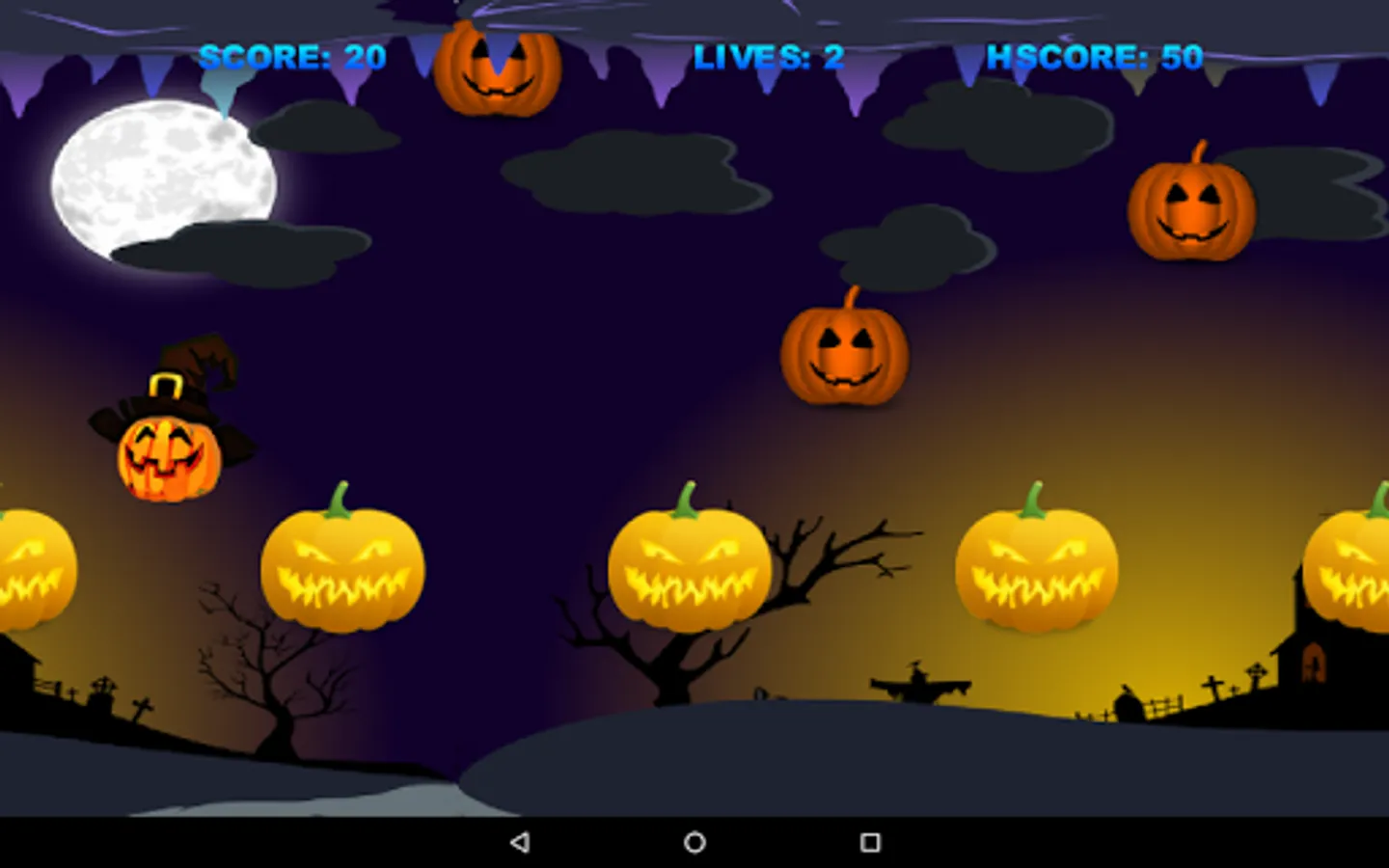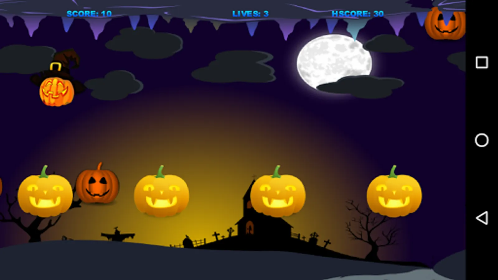 Touch the screen to move the Pumpkin Witch. Collect all the good pumpkins, but not the bad ones. Don´t touch the ceiling or the ground, otherwise you will die.