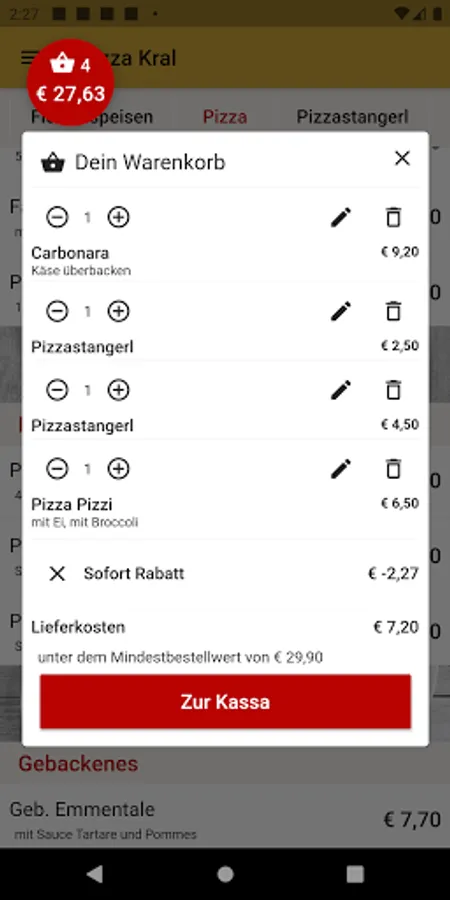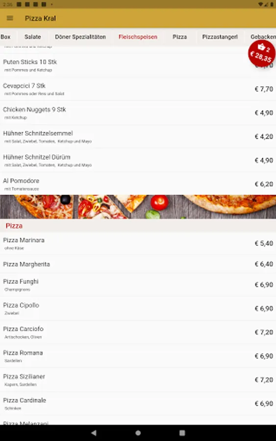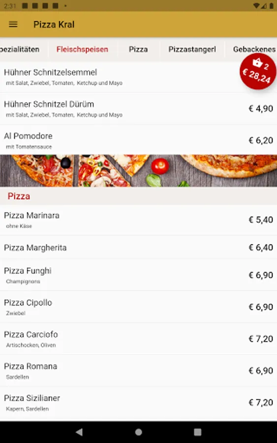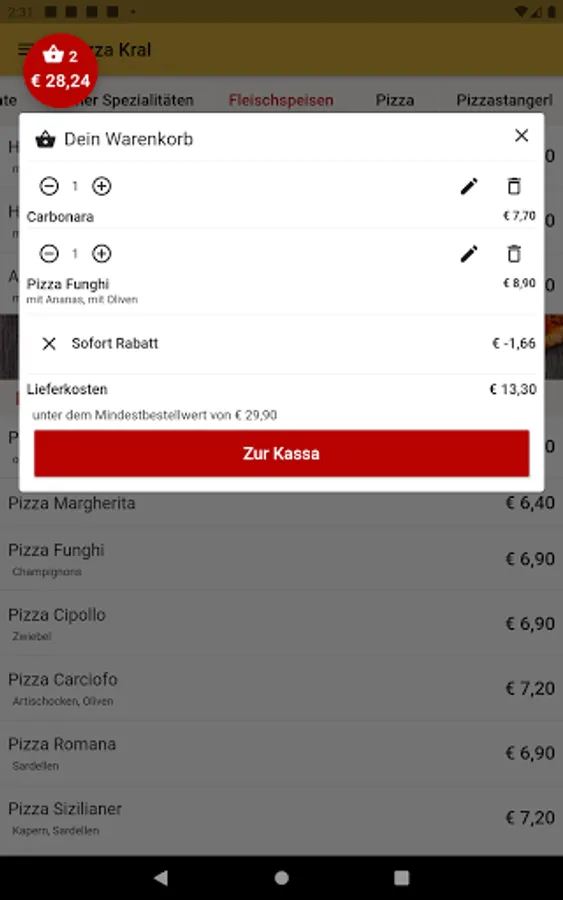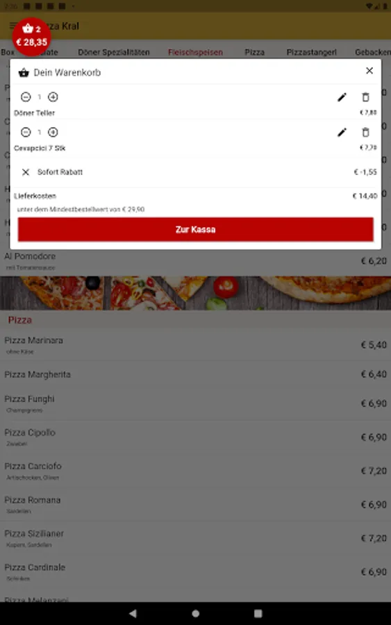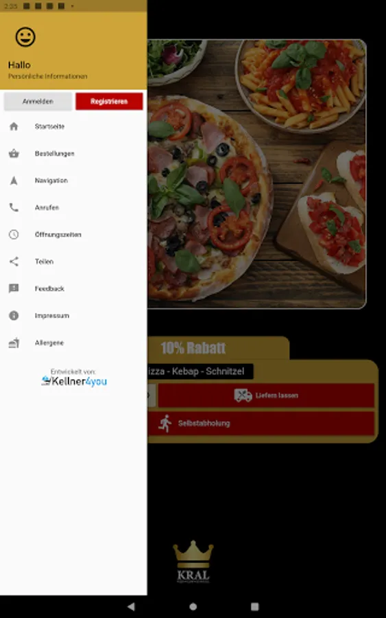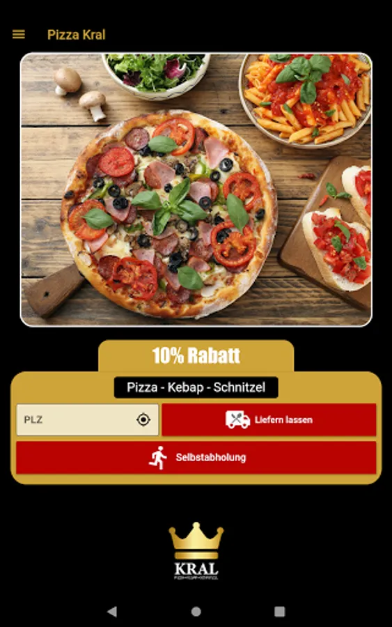 Pizza Kral Wolkersdorf now also delivers to your home. Order Italian pizza, pasta, salads, drinks and desserts conveniently and easily online. Now simply order food online via the web or via the app. Choose your favorite food, pay easily & securely and food will be delivered! Simply order food and have it delivered for free! Pay in cash or online. Great offers. Excellent service. Fast delivery.