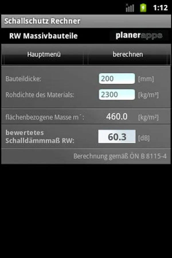 The function RW solid components is used for quick and easy calculation of the weighted sound reduction index Rw of solid single-shell walls and ceilings according to ÖNORM B 8115-4, formula (1) by entering layer thickness in [mm] and basis weight m'in [kg / m2].