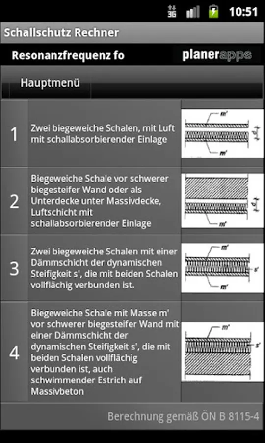 By means of the resonance frequency function, the resonance frequency of double-shell walls can be quickly calculated according to ÖNORM B 8115-4, Table 4 by entering shell thickness in [mm] and mass per unit area m'in [kg / m2] and shell distance or stiffness s'.