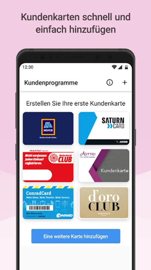 You can clearly save and manage your existing customer cards in the Volksbank Pay app. These can then be scanned in the app at the cash desk - this means the same advantages for you, such as Collect discounts or points as if you were using your physical customer card.