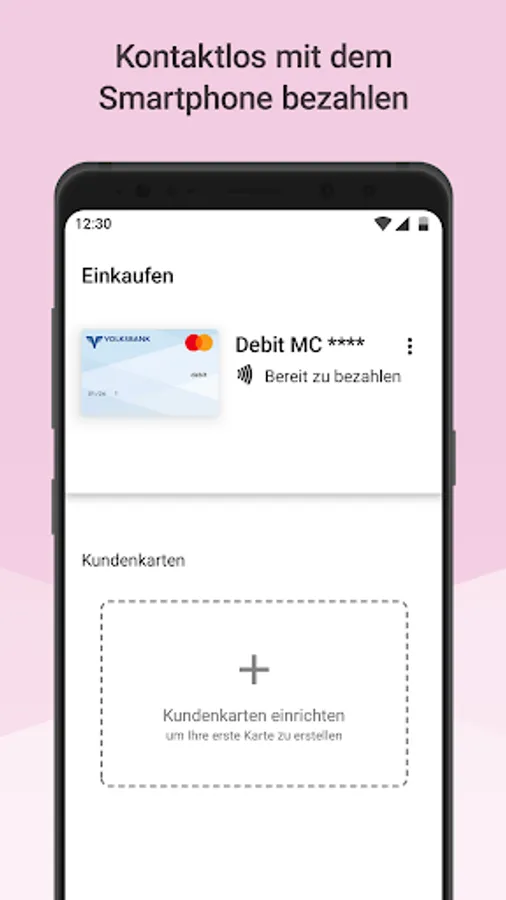 Install the Volksbank Pay app and activate your digital debit card in just a few steps. You can pay easily and contactlessly with your smartphone on the go and leave your debit card at home. Hold your smartphone near an NFC-enabled payment terminal and pay amounts up to 50 euros without entering a PIN. For larger amounts, please enter your PIN at the POS payment terminal - as with your plastic card.