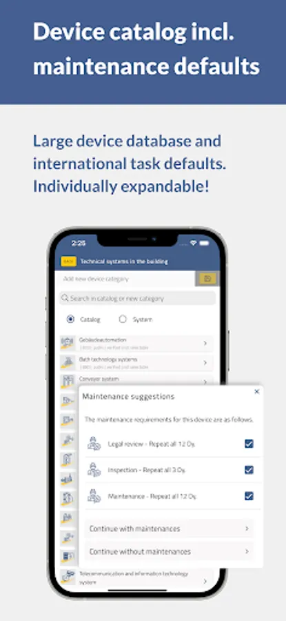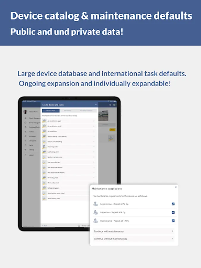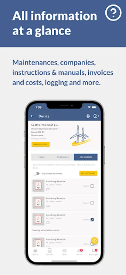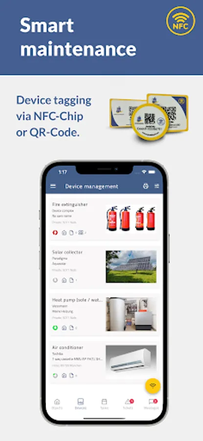 Track your devices requiring regular maintenance conveniently, utilizing 21st century technology. Apply QR codes or NFC markers to your devices and keep track of your inventory. Enter the respective maintenance dates and let MyBuiding24 remind you just in time! This is not only convenient but makes for a calm mind. Especially when it comes to documentation and warranty claims regarding insurances and maintenance duties required by law!