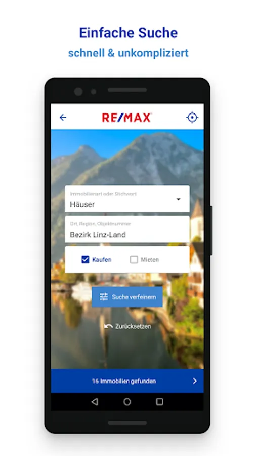 Be the first to be informed about new properties as soon as RE / MAX offers them to match your search request - via push notification directly to your smartphone. Put your apartments, houses, land or other real estate in your watch list and get notified about updates. Simply contact the real estate agent you trust. Query the exact address of real estate directly on your smartphone and, by registering with MyRE / MAX, use all of your saved real estate on any device. The RE / MAX app offers all of this and much more.