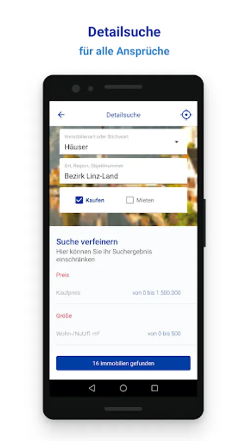 • Numerous search options, such as district, location or region search, equipment, filtering by purchase price, rent, radius, living space, usable space, and much more.