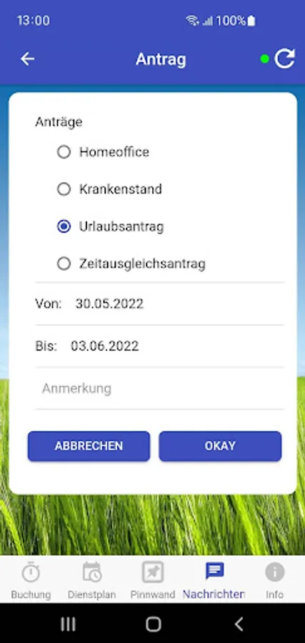 This app allows you to easily send a request for vacation or compensatory time to your personnel management using a simple formula.