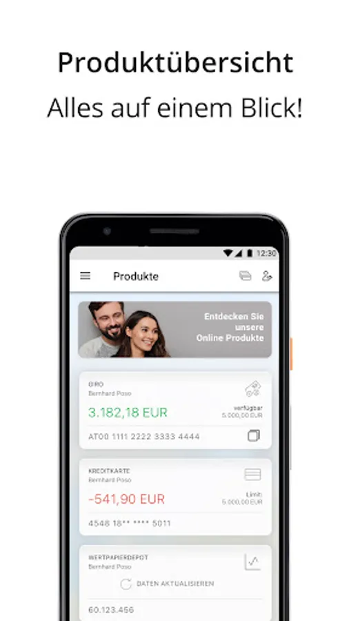 The POSO online banking app with pushTAN is state-of-the-art for mobile banking. So you can keep an eye on your finances at all times, even when you are on the move, all in a single app: