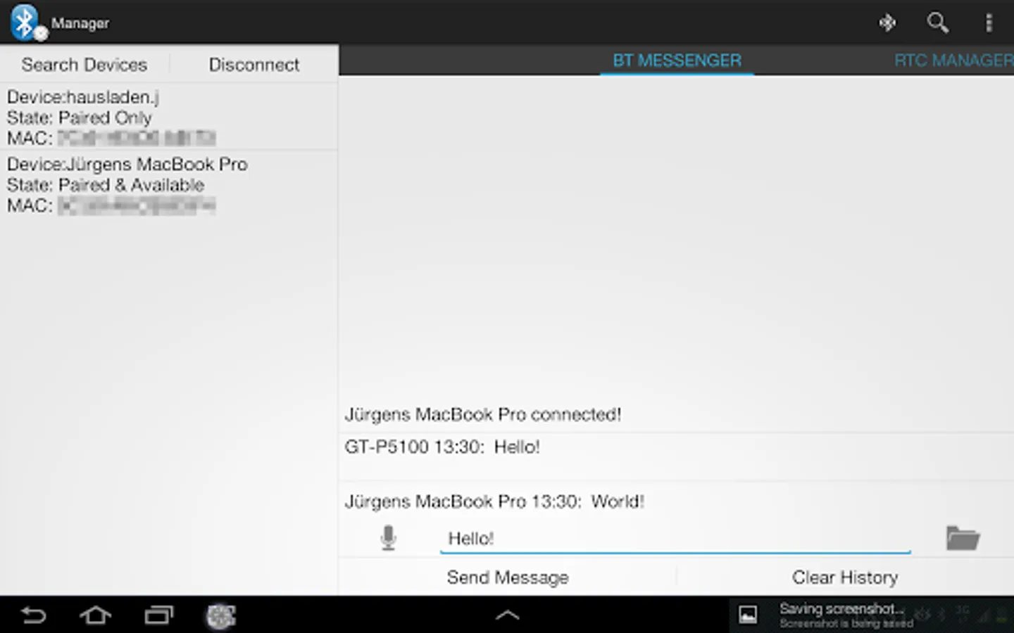 Bluetooth SPP Manager is an app, which provides communication between Bluetooth enabled devices. Therefore it uses the RFCOMM Protocol also known as Serial Port Protocol (SPP) to transmit data between devices. This app shows various properties of connected Bluetooth devices as well as devices around and communicates with them. A built in server can accept incoming connections from any other device. Furthermore this app has an integrated Real Time Clock Manager. With this feature someone can send the current or some predefined time to a remote device. For example this enables to set the RTC of a microcontroller and further show the current time on a LCD.