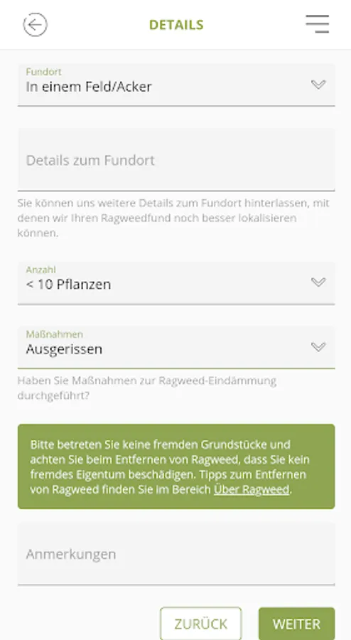 In addition to reporting the find, you can also let us know whether you suffer from a ragweed pollen allergy and how severe the local exposure is. In this way, we are able to more precisely record the population of ragweed, which sometimes varies greatly from year to year, and to take targeted measures on the part of the participating institutions.