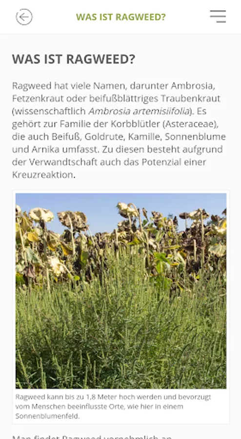 As Austrian pollen information, we are aware of the problems of the neophyte ragweed. However, ragweed is not only a major problem for the health sector, it also causes costs for road maintenance, in agriculture and in general in the economic sector. In the Ragweed Finder you can find out more and everything you need to know about the topic.
