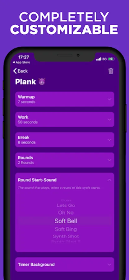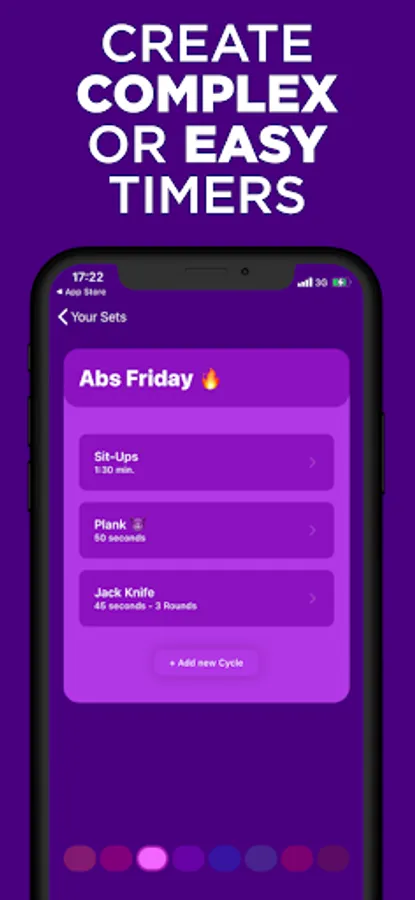 Create simple second-short or complex hour-long intervals with custom set and cycle durations including custom break- and warmup-lengths, round-counts, sounds and colors.