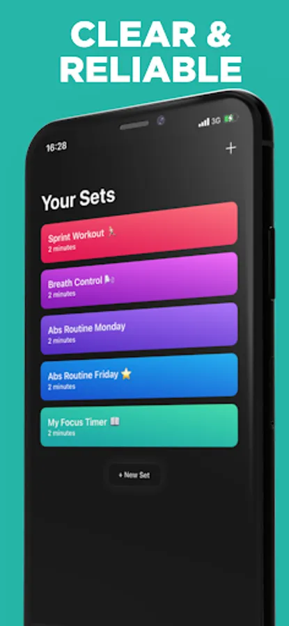 Create complex sets and get them visualized simple and minimalistic with big digits, bright colors and hand-crafted sounds to support you keeping the focus.
