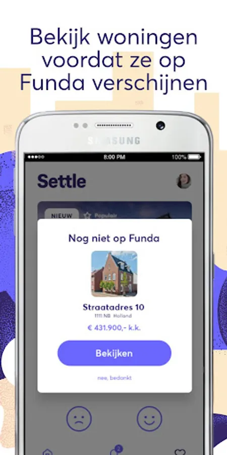 Settle has been developed to serve home-seekers even better. Settle provides the perfect personalized match between home seeker and home. Even before the home is on Funda, the perfect home match is presented to the home seeker in an interactive way. Be ahead of your competitor-home seeker, immediately schedule a viewing or place a bid.