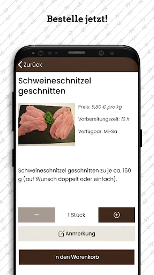 With our Fleischerei Schickmair app you can easily pre-order your desired products and pick them up at your previously defined time.