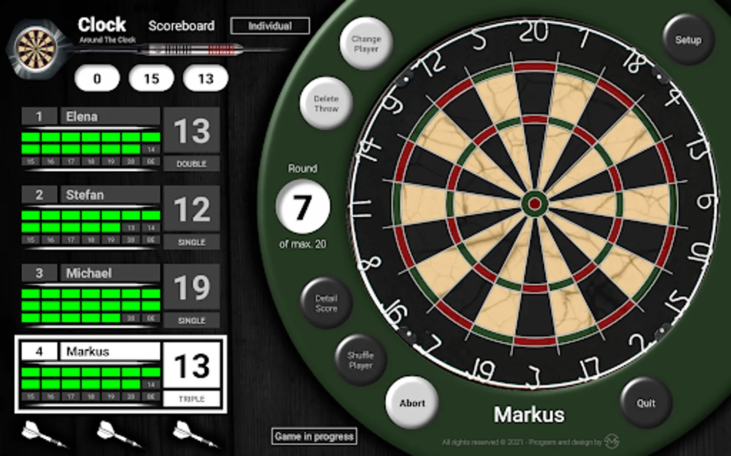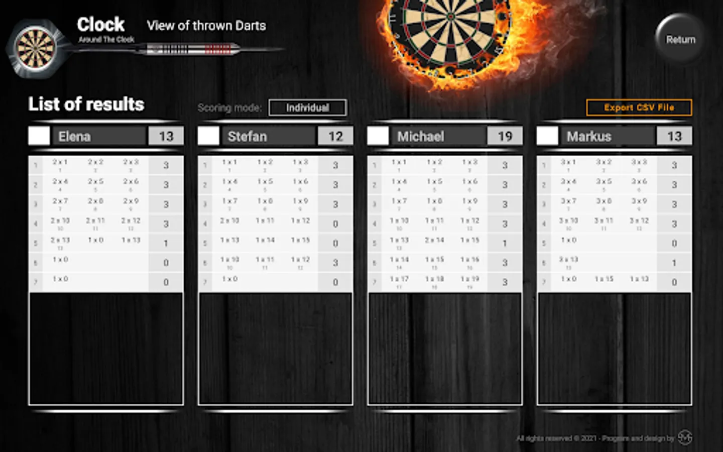 The counting app supports a maximum number of 4 players and allows the selection of all possible game modes: Single, Double & Triple. Furthermore, it provides the possibility to review the thrown darts shown on a summary table as well as it accommodates the option to export csv-files to evaluate your performance externally. Give it a try and have fun with your friends and family with this counting app and particular type of dart game.