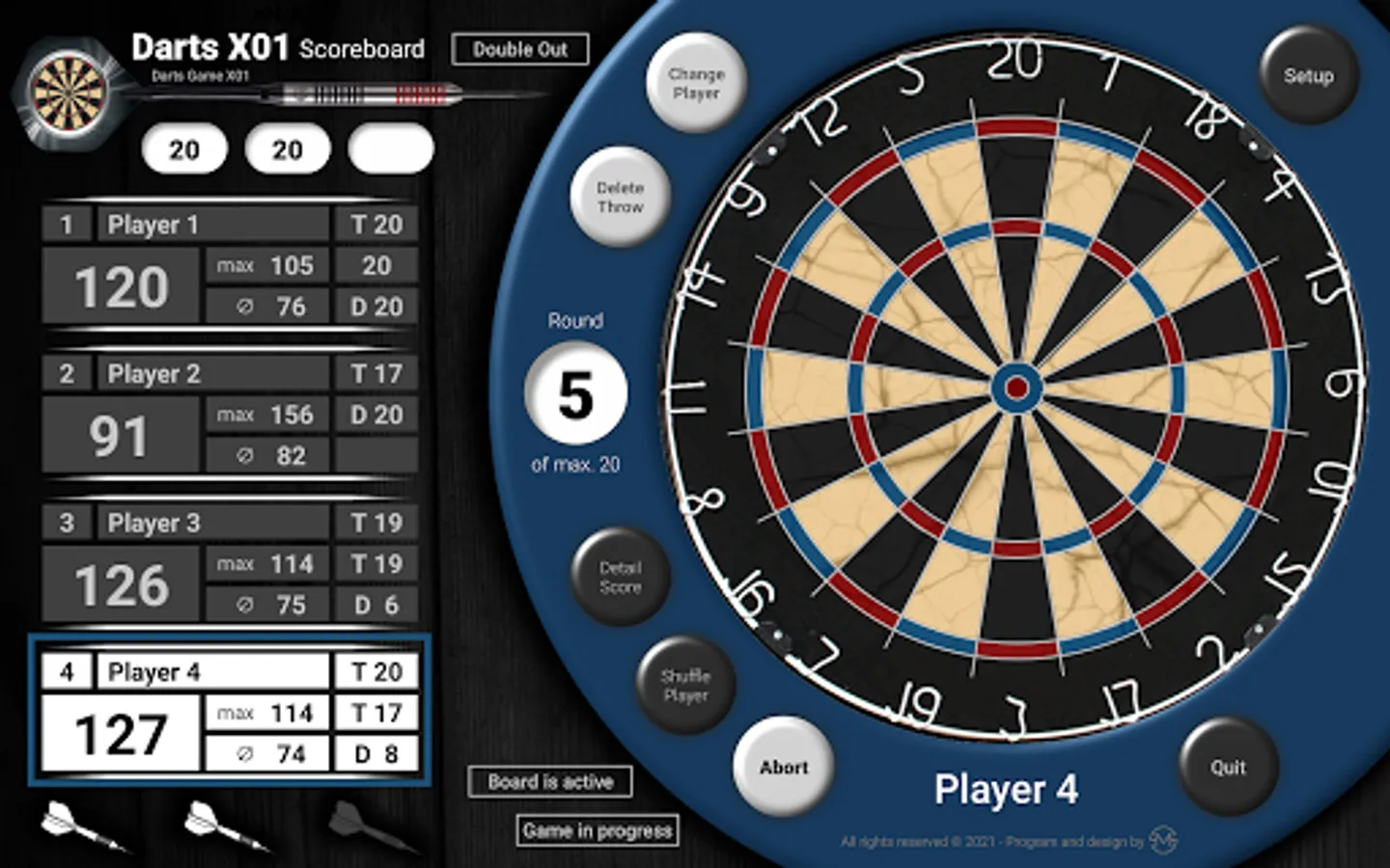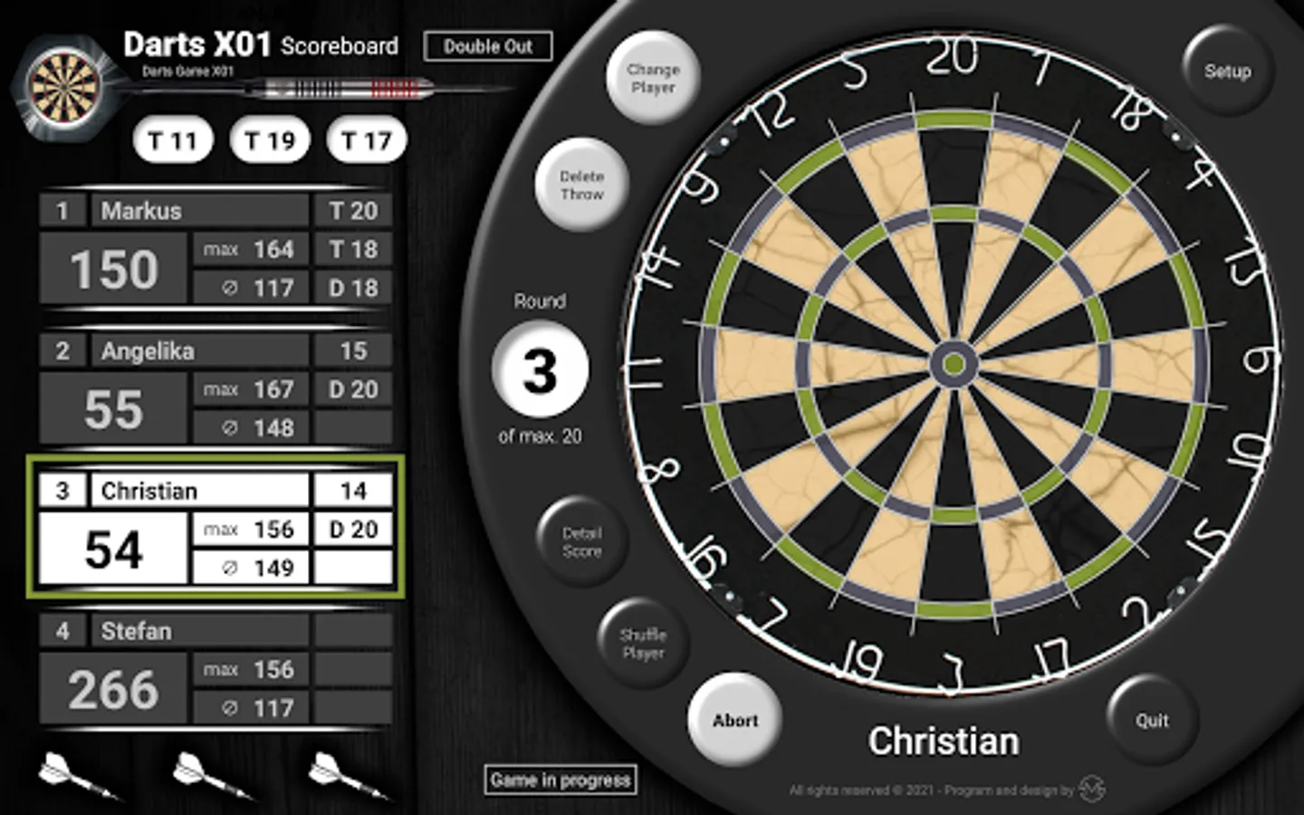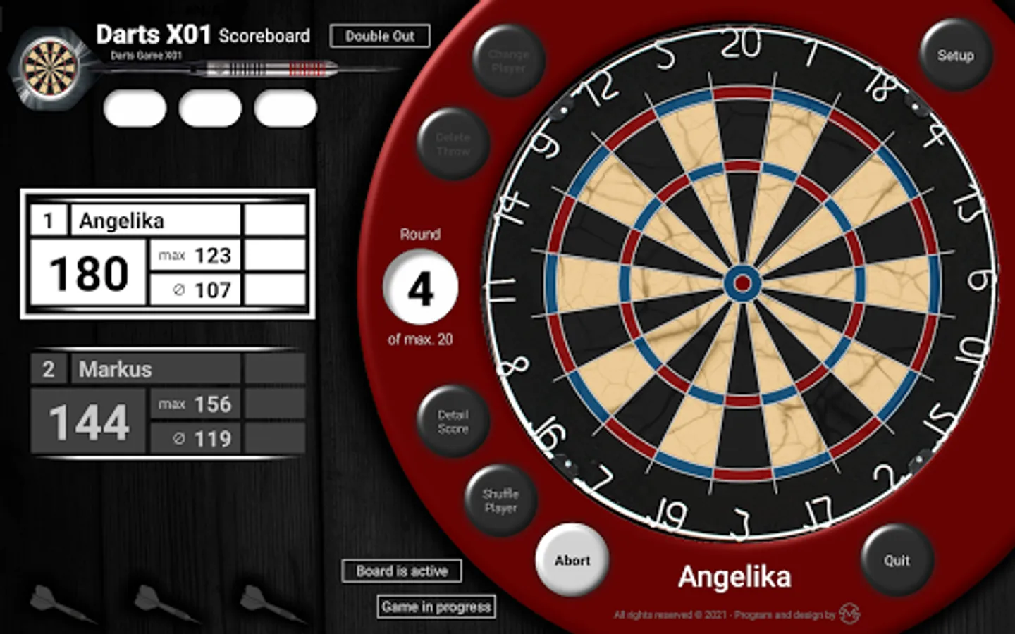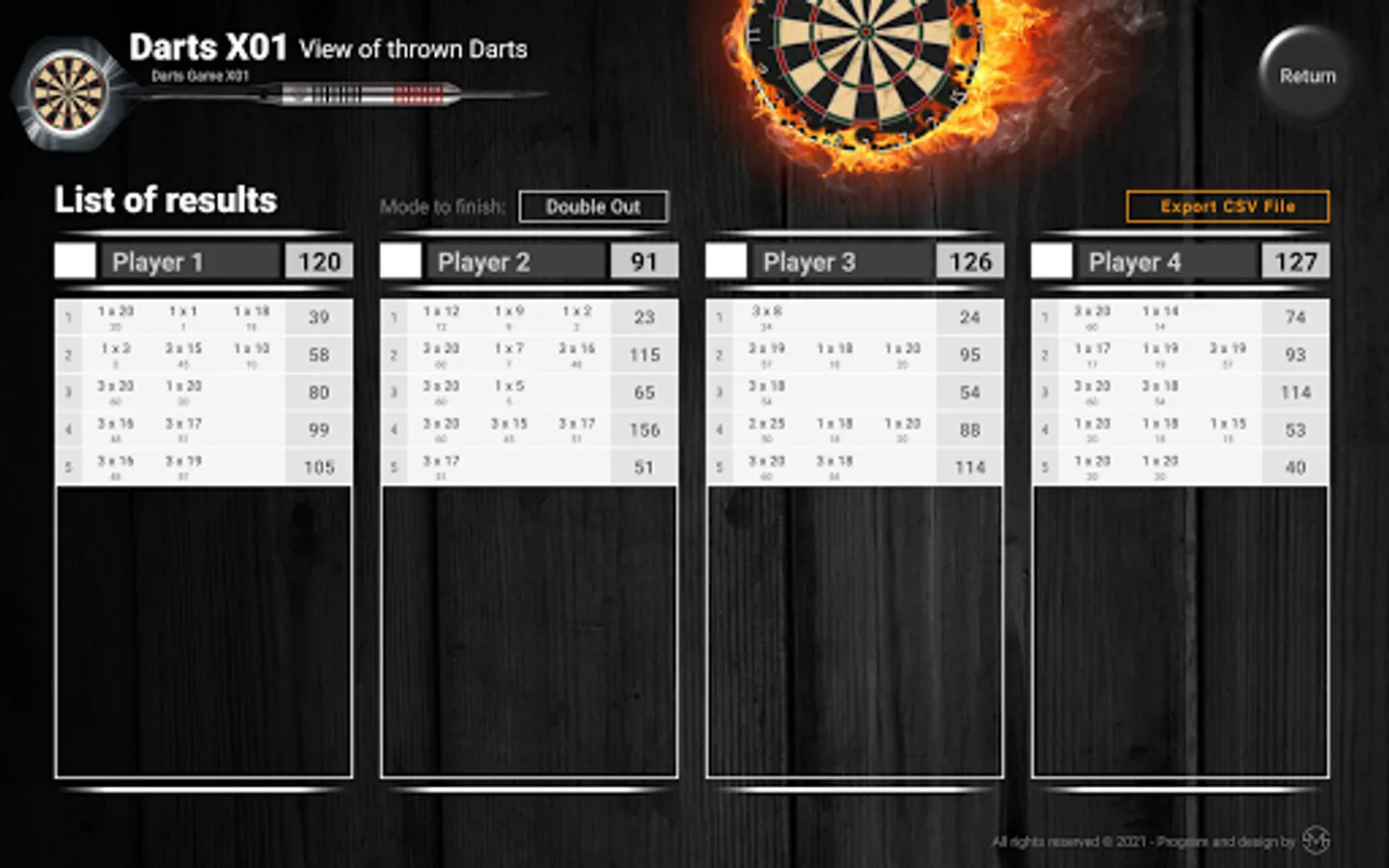 The counting app supports a maximum number of 4 players. It also provides you with a proper suggestion to finish the dart game in style (double out) and like a professional. Furthermore, it provides the possibility to review the thrown darts shown on a summary table as well as it accommodates the option to export csv-files to evaluate your performance externally. Give it a try and have fun with your friends and family with this counting app and most popular game of dart.