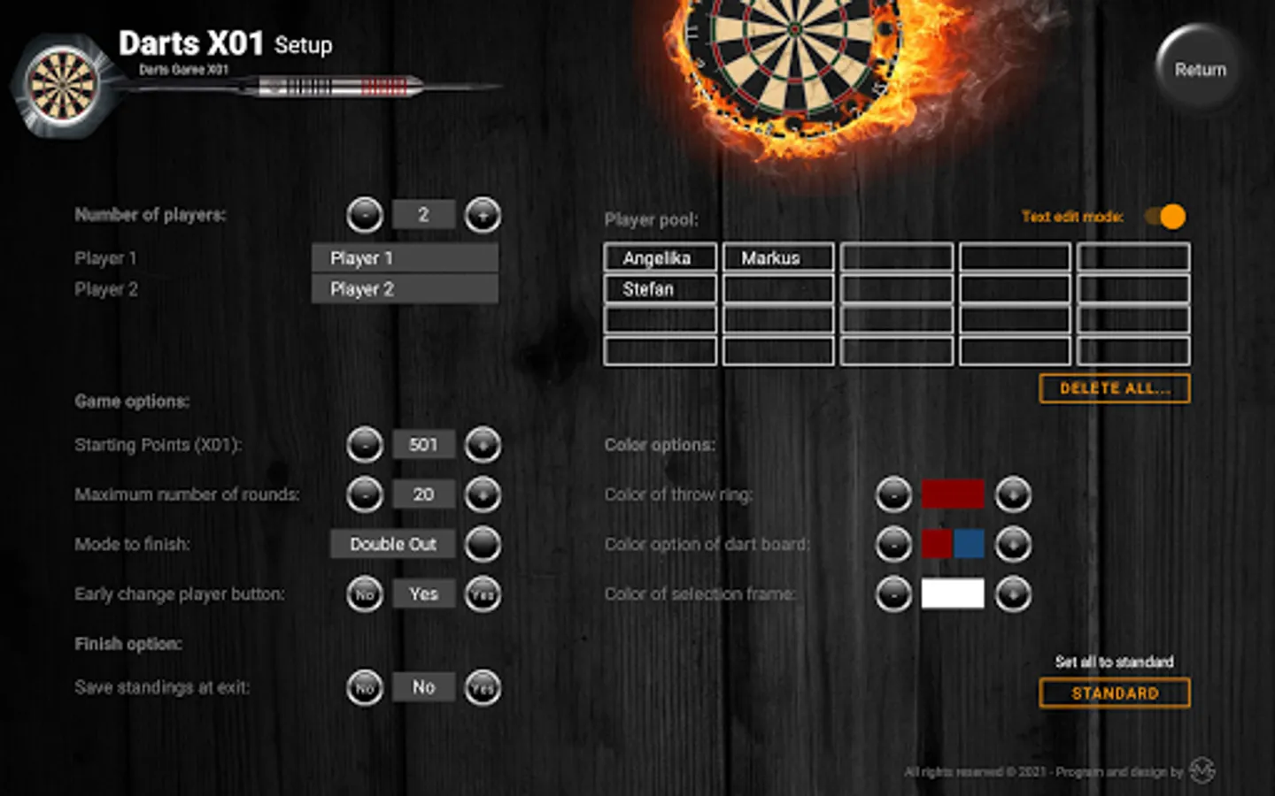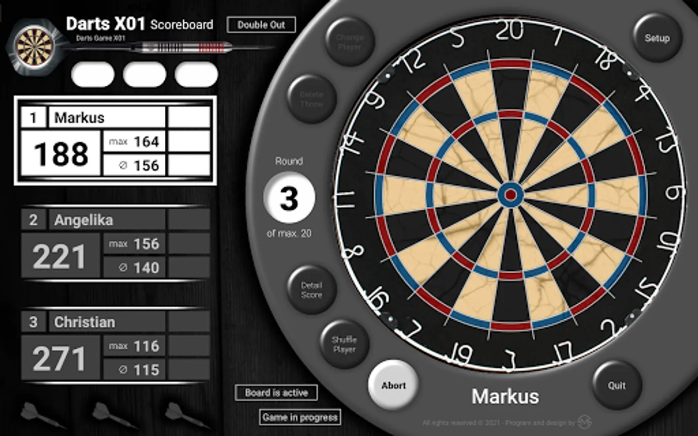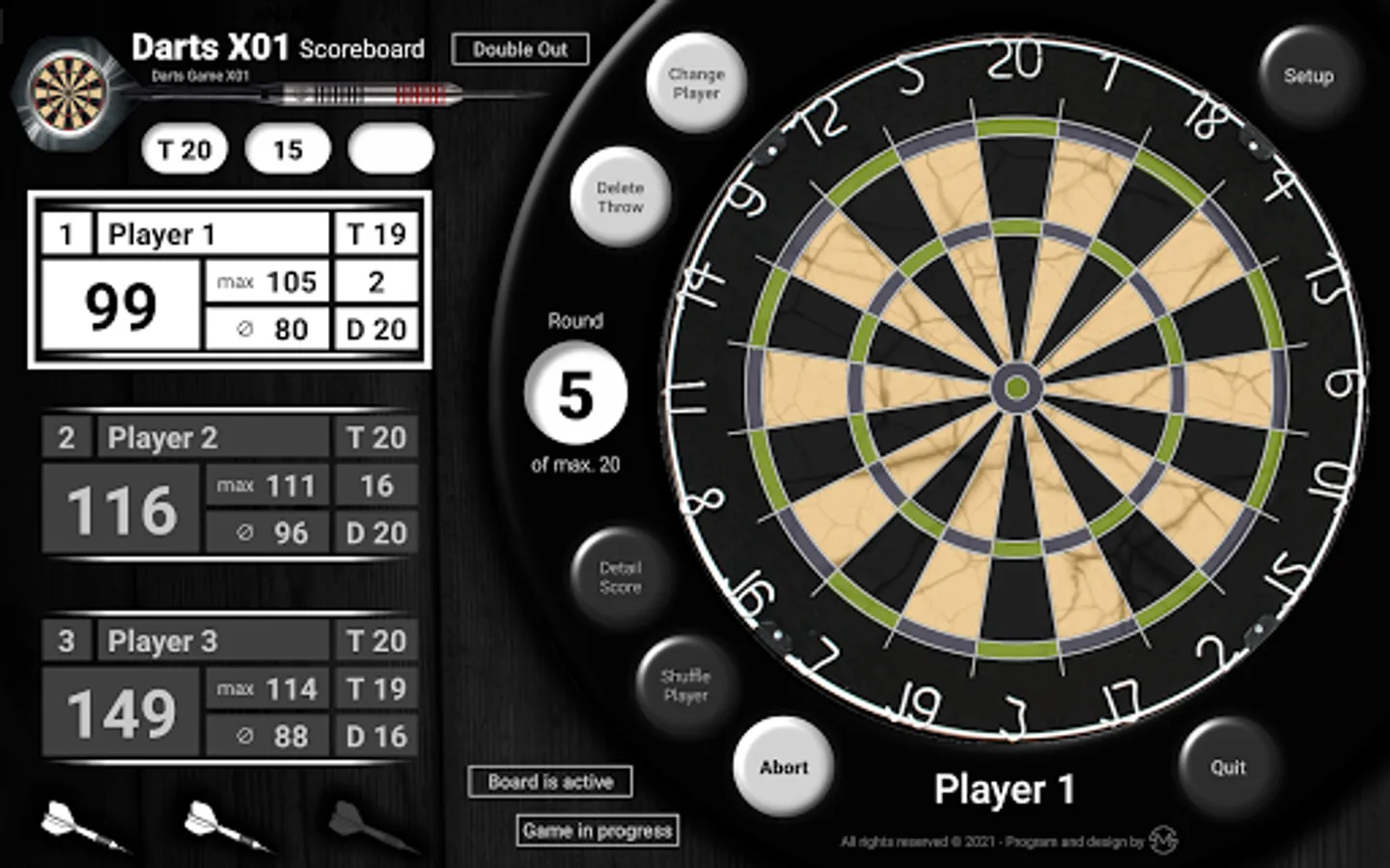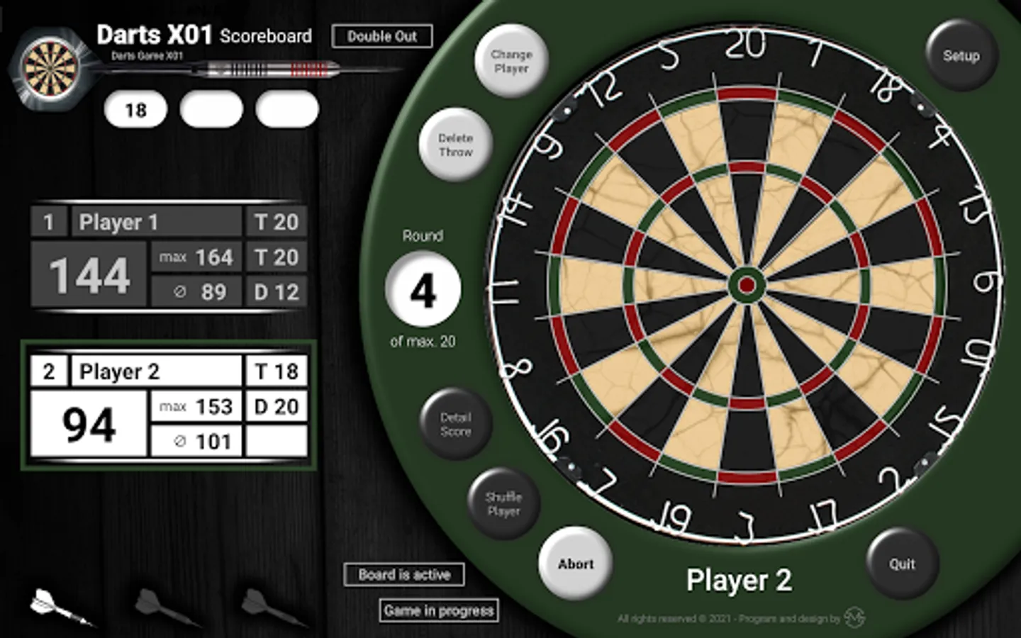 The counting app supports a maximum number of 4 players. It also provides you with a proper suggestion to finish the dart game in style (double out) and like a professional. Furthermore, it provides the possibility to review the thrown darts shown on a summary table as well as it accommodates the option to export csv-files to evaluate your performance externally. Give it a try and have fun with your friends and family with this counting app and most popular game of dart.