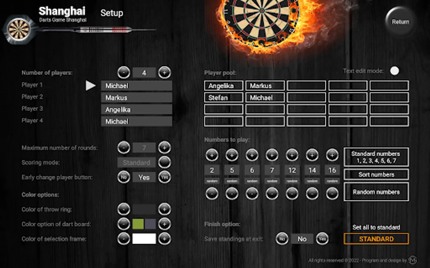 The counting app supports a maximum number of 4 players and provides the possibility to select your own numbers to be played or let the app generate random numbers for the purpose to keep up the fun level and challenge, if you what to enhance your skill and game. Furthermore, it provides the possibility to review the thrown darts shown on a summary table as well as it accommodates the option to export csv-files to evaluate your performance externally. Give it a try and have fun with your friends and family with this counting app and particular type of dart game.