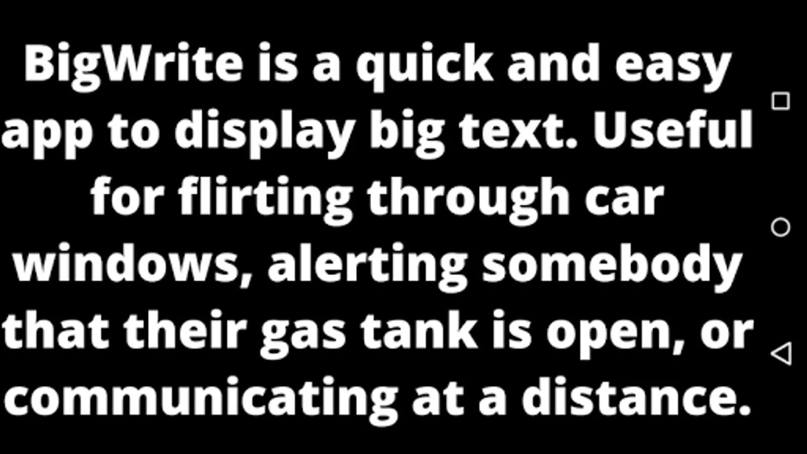 BigWrite is a quick and easy app to display text, big. Useful for flirting through car windows, alerting somebody that their gas tank is open, or simply flashing any bit of text. Just type in some words and hold up your device.
