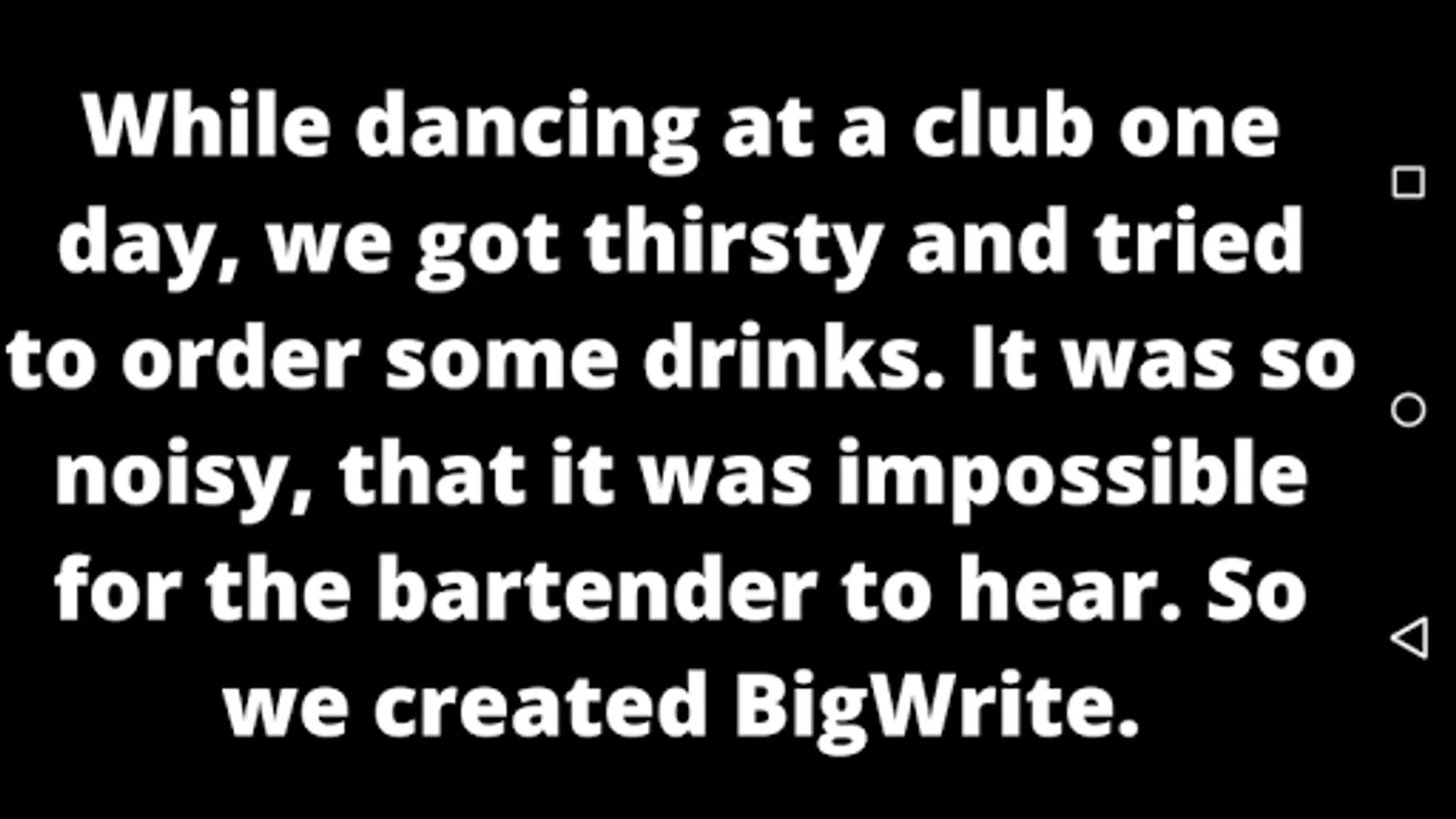 We came up with the idea while dancing at a club one day. We got thirsty and tried to order some drinks. The place was so noisy, however, that it was simply impossible for the bartender to hear the order. As I was screaming at the top of my voice, I came up with this App idea. BigWrite is a quick and easy tool for getting your words across in a BIG way.