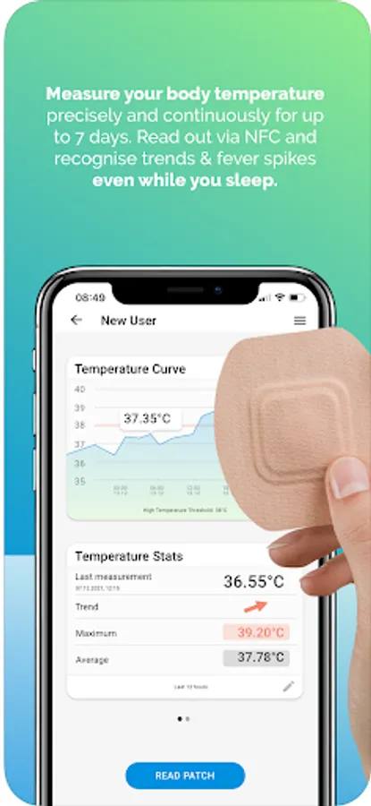 The app shows the current body temperature as well as temperature curves and trends. Elevated temperature or fever can thus be detected within seconds. Even overnight fever spikes are no longer missed.