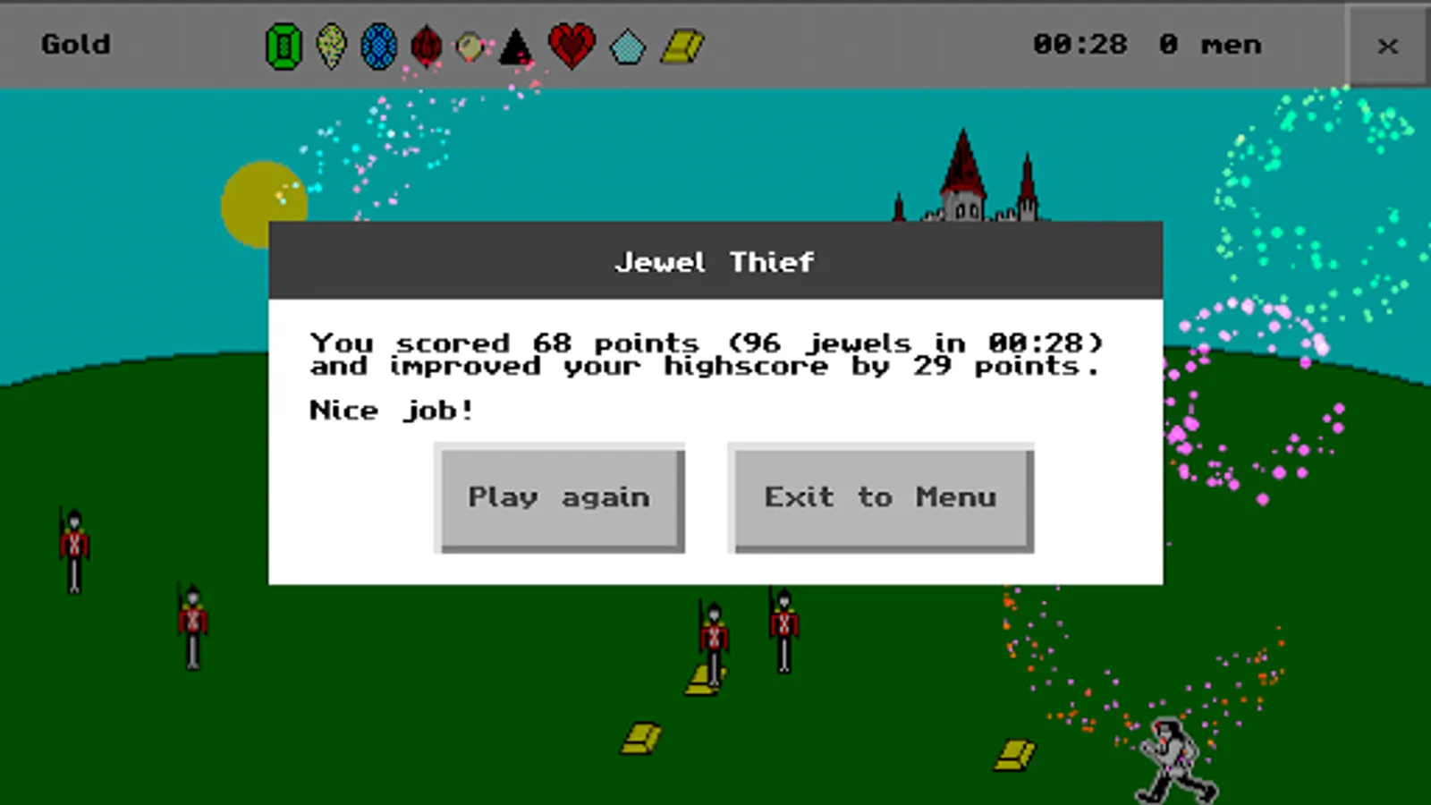 Collect all jewels as fast as possible and avoid guards and borders. You get extra men when you collect jewels.