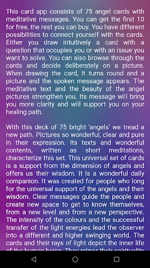 This card app consists of 75 angel cards with meditative messages. You can get the first 10 for free, the rest you can buy. You have different possibilities to connect yourself with the cards. Either you draw intuitively a card with a question that occupies you or with an issue you want to solve. You can also browse through the cards and decide deliberately on a picture. When drawing the card, it turns round and a picture and the spoken message appears. The meditative text and the beauty of the angel pictures strengthen you. Its message will bring you more clarity and will support you on your healing path.