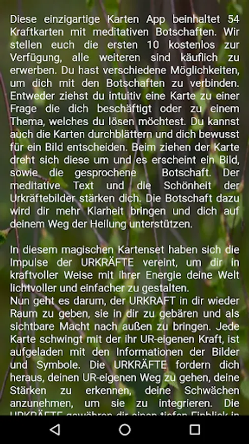 This powerful elemental forces designed app includes 54 power cards with messages that were transmitted by light beings and nature beings. The Holy Spirit works through the painted images. These radiate the healing vibration of the forces of nature and are directly inspired by the elemental forces and blessed.