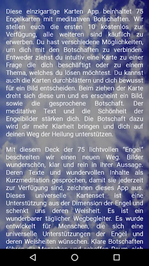 This lovingly crafted light companion app includes 75 angel cards with messages that were transmitted by angels and light beings. The Holy Spirit works through the painted images. These radiate the healing vibration of light beings and are inspired and blessed directly by angels.