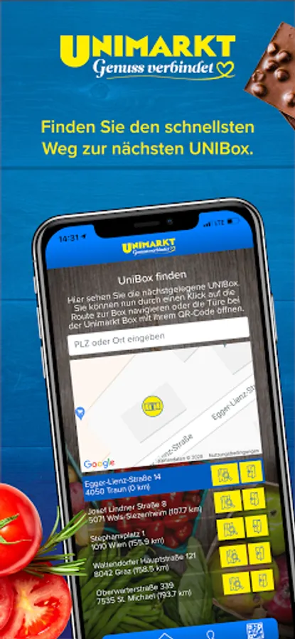 The branch finder shows you the nearest Unimarkt locations and the UNIbox, and the route planner shows you the direct route to the surrounding Unimarkt locations. Choose your branch to be always informed about opening times and current promotions.