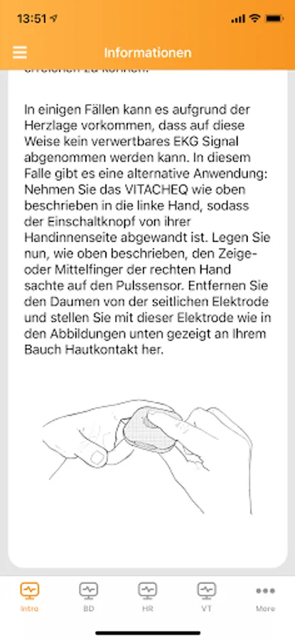 The VITACHEQ app is intended to be used in conjunction with a mobile device (VITACHEQ) for continuous, cuff-free measurement of blood pressure on the basis of the pulse wave speed, which is determined from ECG and optical pulse signals. Both signals are recorded on the periphery (preferably the thumb and index or middle finger) and used to calculate the heart rate, the systolic and diastolic blood pressure and the pulse wave speed. Various HRV parameters are also recorded on the basis of the ECG signal. This accompanying mobile app is used for communication with the device, its configuration, the display of the raw signals and calculated values, the explanation of the recorded HRV parameters, the user administration, the measurement support and the data storage.