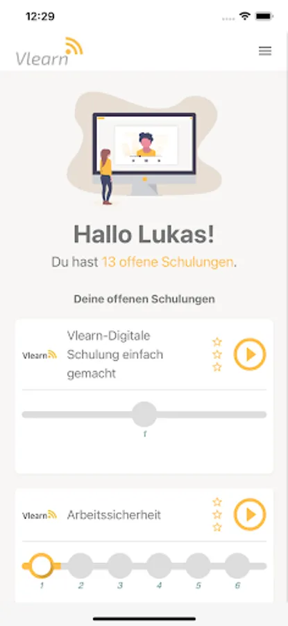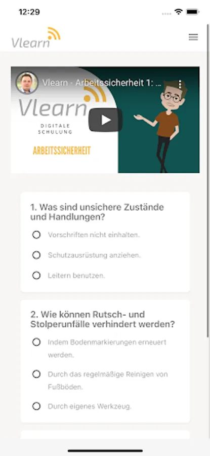 With Vlearn, your employees and guests can start immediately with digital video training. The Vlearn app contains all relevant training topics and languages with subtitles - according to a uniform standard. Immediately after the video there is an interactive query of the training success with documentation for the next audit.