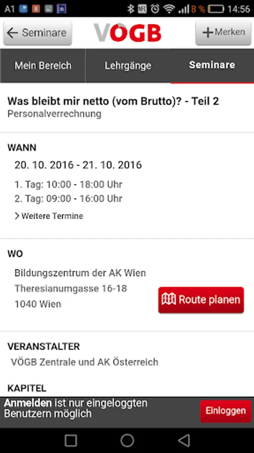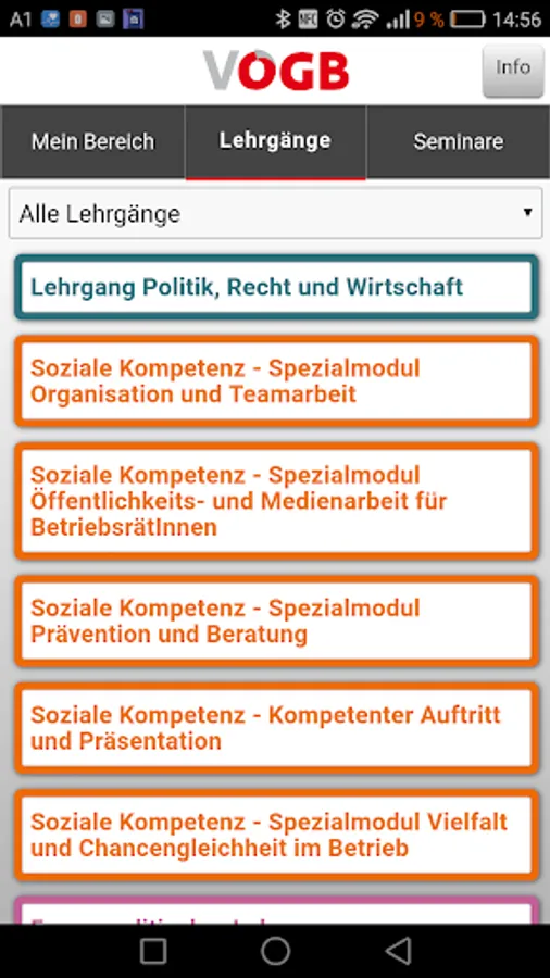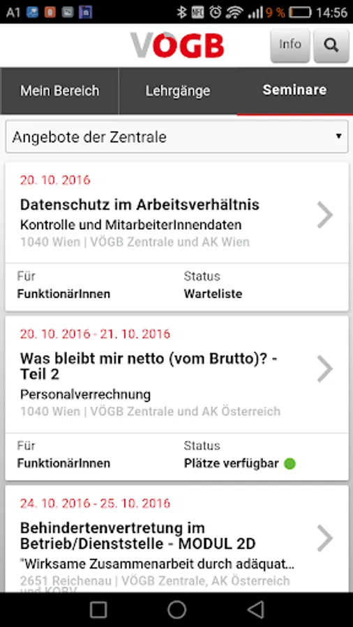 The APP provides an overview of current seminars and courses of VÖGB. The following courses can currently be completed during VÖGB (Association of Austrian Trade Union Education):