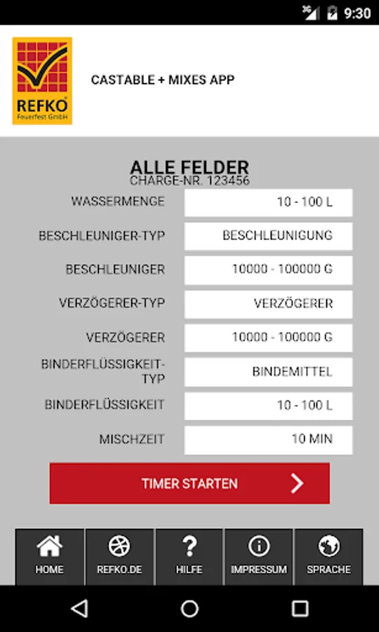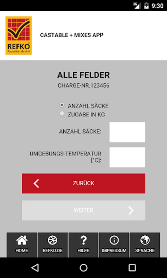 Based on the input of the material quantity, the required water and / or binder quantity will be calculated and displayed.