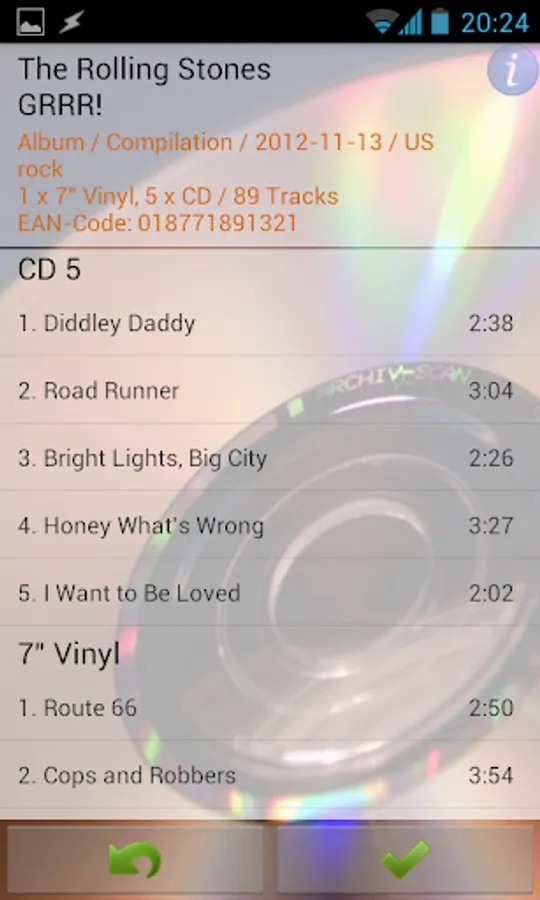 - Download of tracklists, artist, title, genres, release date etc. by scanning barcode of CDs or by searching online (search for artist, album or track on MusicBrainz)