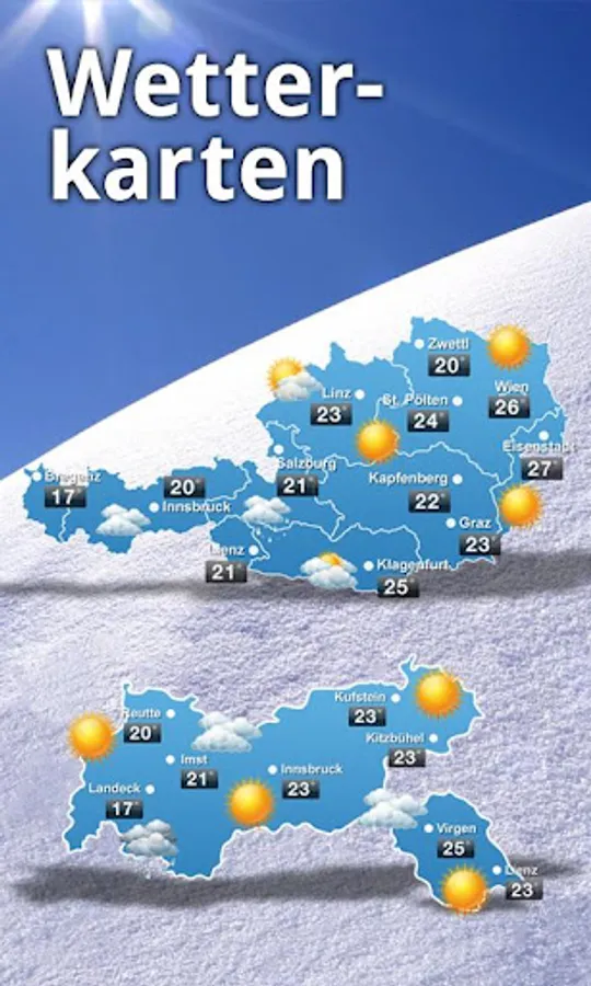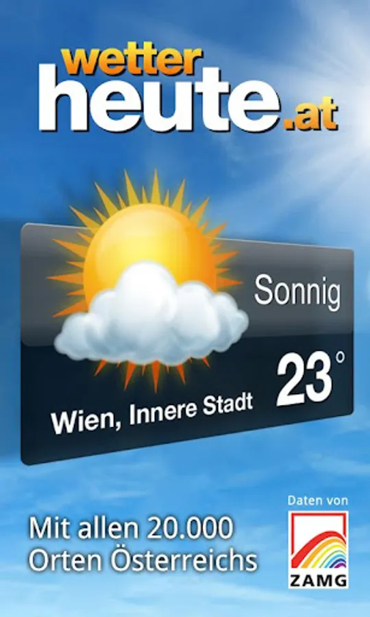 With the online data of ZAMG / Central Institute for Meteorology and Geodynamics. In portrait mode, shows the weather app on the Ortwetter for all towns in Austria, including text forecast for the next 10 days. The screen background adapts to the weather forecast.