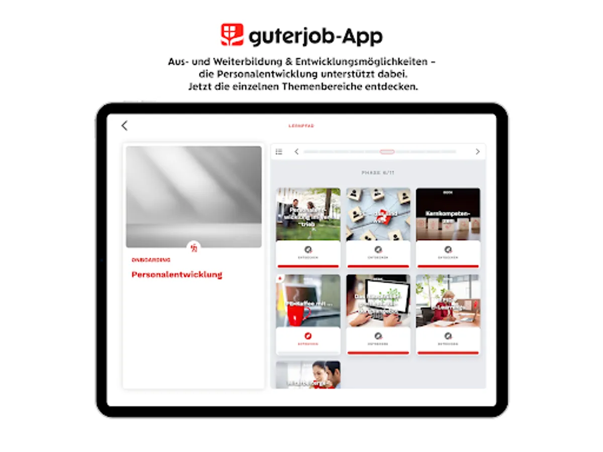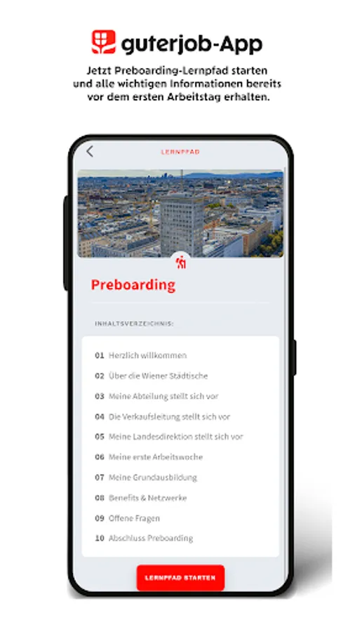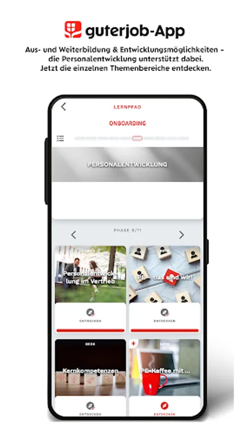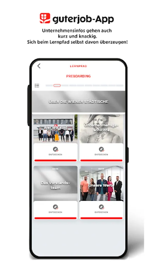 After signing the contract, the invitation takes you directly to the app, in which the company and your future department introduce themselves. Benefits, networks, information on training and further education and much more are explained using flashcards. Contact persons get a face. Important questions are summarized and already answered. You can also answer quiz questions, submit feedback and enter the competition.