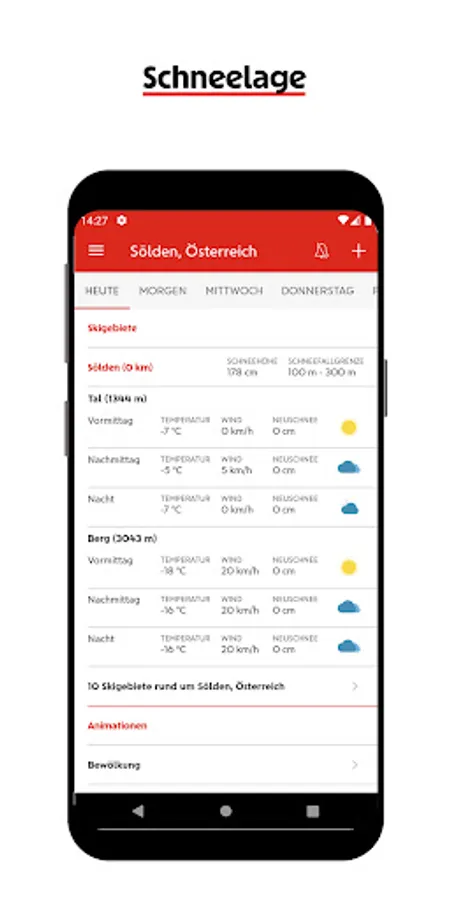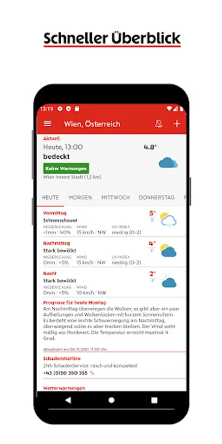 The Weather Plus app Wiener Städtische and ZAMG (Central Institute for Meteorology and Geodynamics) offer new features for you. In addition to the modern design, you can look forward to many useful functions: weather warning for * any location in Austria and 5-day weather forecasts for your destination abroad.