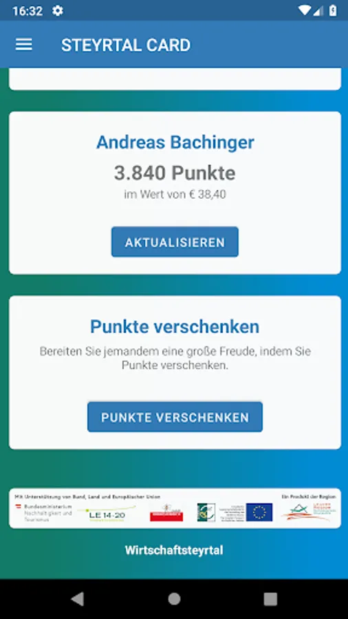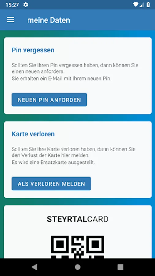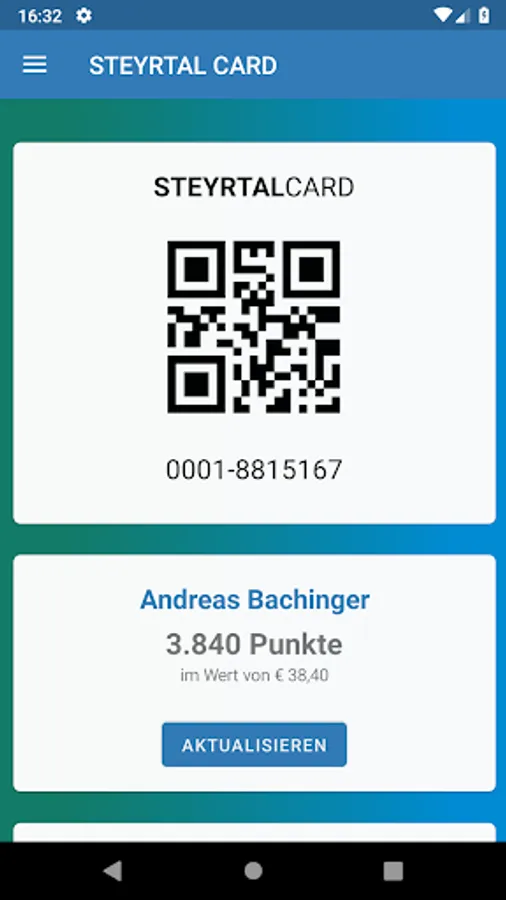 With the STEYRTALCARD APP you can check your current score and score history. To top up or redeem your points, the QR code of your card is shown on the display of your mobile phone. This eliminates the need to carry a "real" card.