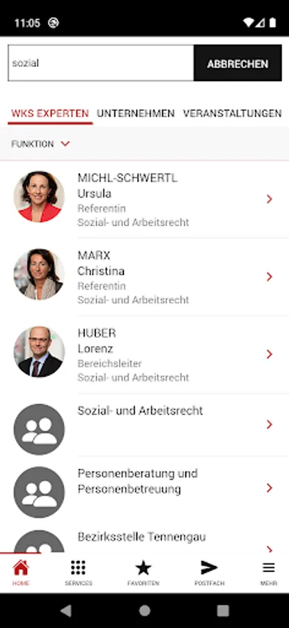 The application offers numerous functions that are very useful for entrepreneurs. The core is the search for competent contacts on a wide variety of topics. In this way you can search specifically for names if you have already been in contact with them and therefore know them. However, if you do not know the name or the department for a particular question, no problem either: When searching in the digital service manual of the WKS, you can of course also search for the appropriate experts by entering key words